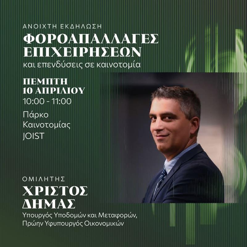 Ανοιχτή εκδήλωση, παρουσία του Υπουργού Υποδομών και Μεταφορών κ. Χρίστου Δήμα, με τίτλο “Φοροαπαλλαγές επιχειρήσεων και επενδύσεις στην καινοτομία”, θα πραγματοποιηθεί στο Πάρκο Καινοτομίας JOIST, σήμερα Πέμπτη 10 Απριλίου 2025, 10.00πμ – 11.00πμ.