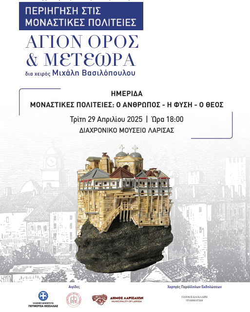 Στo πλαίσιo της Έκθεσης «Άγιον Όρος και Μετέωρα – Περιήγηση στις Μοναστικές Πολιτείες», θα πραγματοποιηθεί Ημερίδα στο Διαχρονικό Μουσείο Λάρισας την Τρίτη 29 Απριλίου, ώρα 18:00 με θέμα «Μοναστικές Πολιτείες: Ο άνθρωπος – η φύση – ο Θεός».