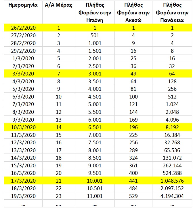 Μάλιστα, με ακόμη μεγαλύτερη ταχύτατα, την 21η μέρα, στις 17/3/2020, τρεις μόνο βδομάδες από τη μέρα της εμφάνισης του πρώτου κρούσματος (26/2/2020), στην Πανάκεια υπήρχαν πολύ περισσότεροι από 1.000.000 φορείς του ιού! Συγκεκριμένα, αυτό συνέβη στις 17/3/2020. Στην Πανάκεια τότε υπήρχαν 1.048.576 φορείς (!), στην Ακεσώ 441 φορείς, ενώ στην Ηπιόνη 10.001 φορείς.