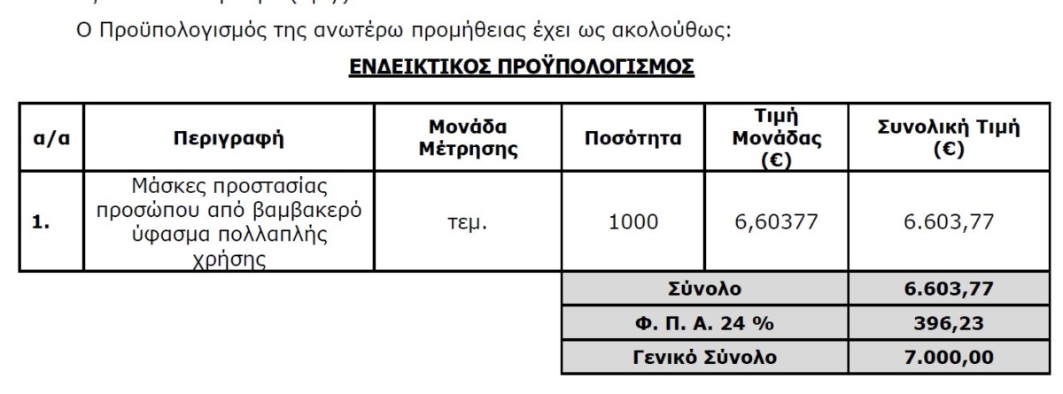 Την ώρα που οι τιμές των προστατευτικών μασκών, όπως προκύπτει από την προμήθεια που έκανε η ΠΕΔ Θεσσαλίας για να προμηθεύσει το σύνολο των δήμων της Θεσσαλίας κυμαίνεται λίγο πιο πάνω από 1 ευρώ, το ποσό των 6,6 ευρώ για τις ειδικές(;) αυτές μάσκες μοιάζει εξωπραγματικό.