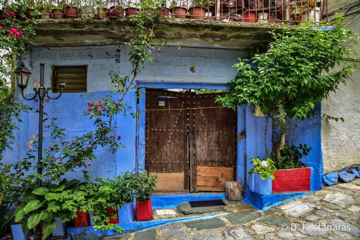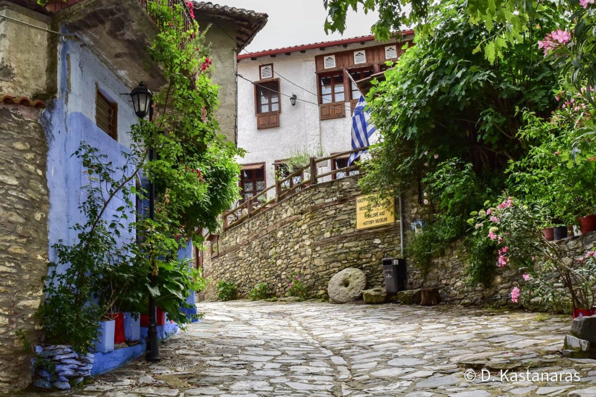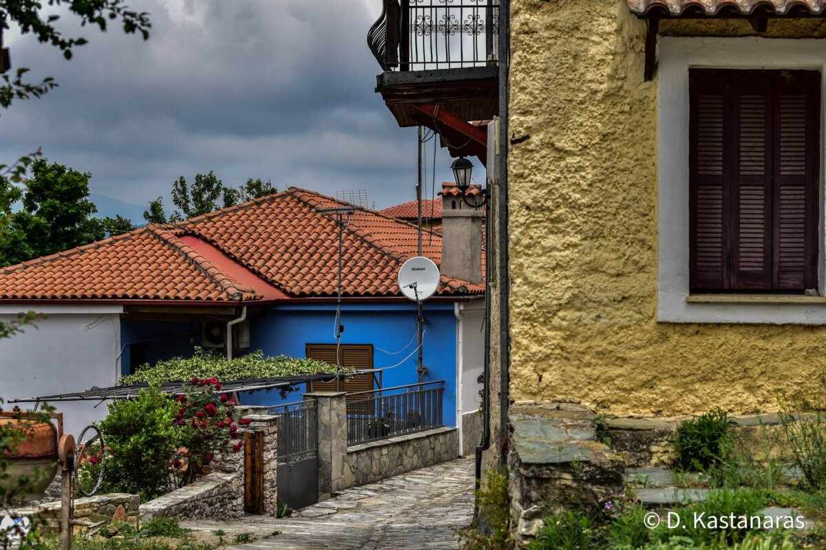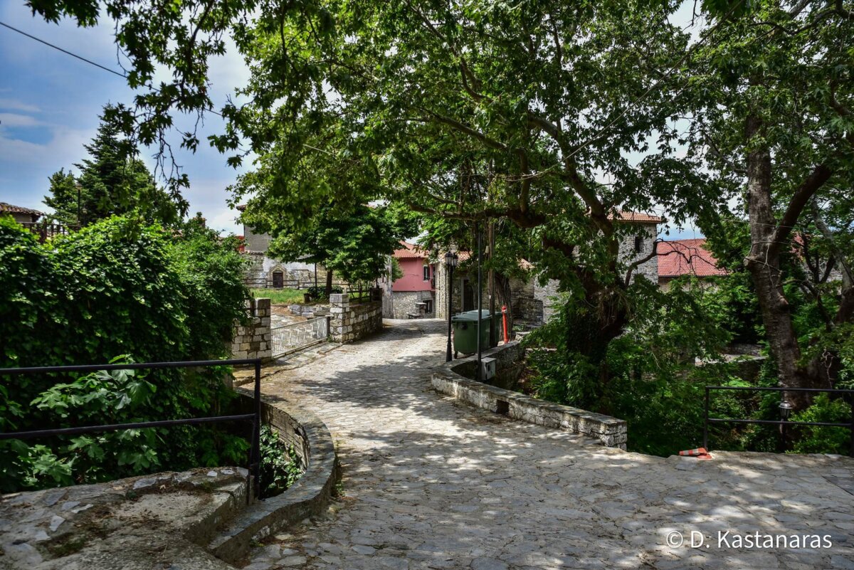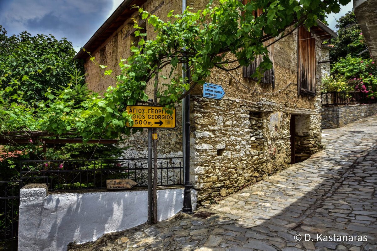 Γυρίζοντας στο σήμερα, αφήνουμε το αυτοκίνητο στην είσοδο του χωριού και συνεχίζουμε με τα πόδια στα στενά καλντερίμια του. Αυλές γεμάτες λουλούδια, παλιές ξύλινες εξώπορτες με πάντα δυο καλά κούτσουρα έξω στον δρόμο για να κάθονται οι γειτόνισσες και να κουβεντιάζουν περνώντας την ώρα τους.