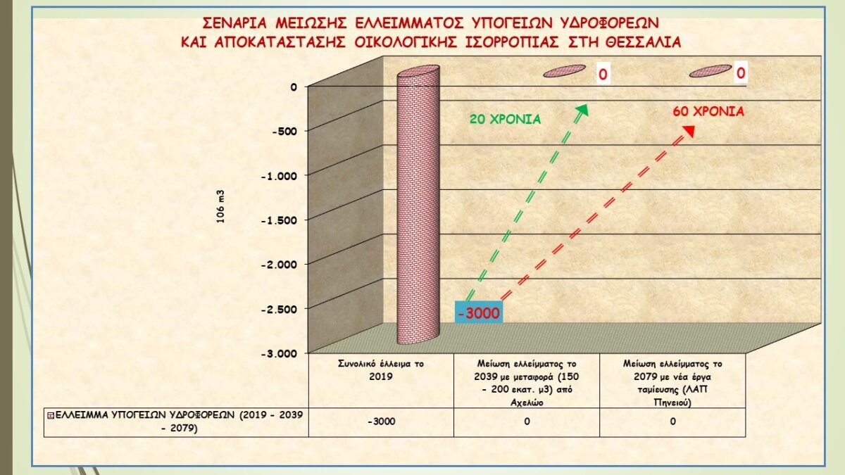 Η άρδευση 2,83 εκ. στρεμμάτων, σε συνδυασμό με την αδυναμία (για πολλά ακόμη χρόνια) υλοποίησης των απαιτούμενων έργων, θα επιβαρύνει περαιτέρω τα υπόγεια οικοσυστήματα (με απολήψεις 200-250 hm3 ετησίως).