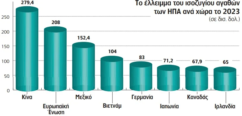 Αποτυπώνεται έντονα ο λόγος στα ακόλουθα στοιχεία: Για το 2023, οι ΗΠΑ είχαν έλλειμμα ισοζυγίου αγαθών με την Κίνα (279,4 δισ. δολ.), με την Ε.Ε. (208 δισ. δολ.) και με το Μεξικό (152,4 δισ. δολάρια). Ακολουθούν Βιετνάμ (104 δισ. δολ.), Γερμανία (83 δισ. δολ.), Ιαπωνία (71,2 δισ. δολ.) και Καναδάς (67,9 δισ. δολ.), αλλά και η Ιρλανδία (65 δισ. δολάρια).