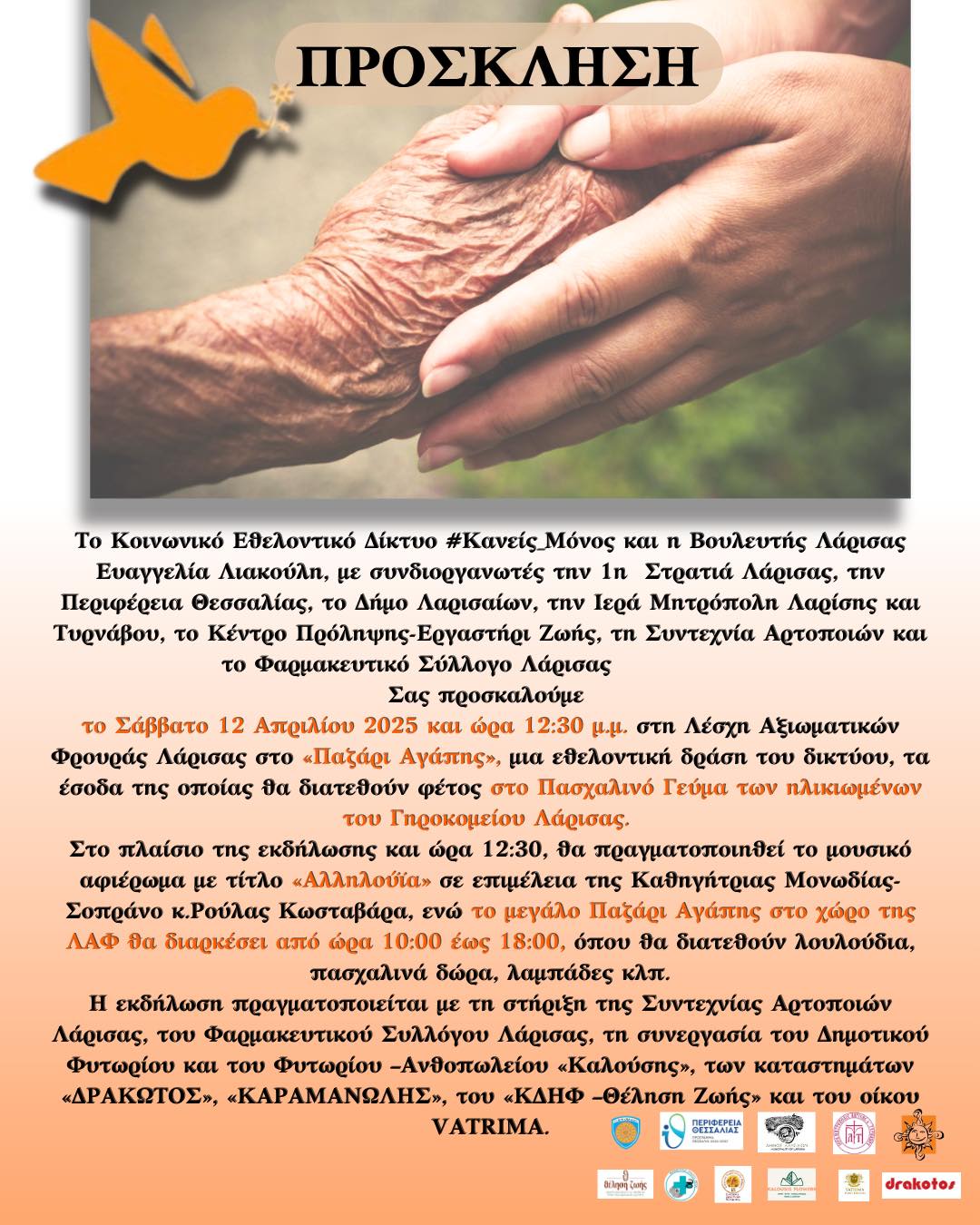Το Κοινωνικό Εθελοντικό Δίκτυο #Κανείς_Μόνος και η Βουλευτής Λάρισας Ευαγγελία Λιακούλη, με συνδιοργανωτές την 1η Στρατιά Λάρισας, την Περιφέρεια Θεσσαλίας, το Δήμο Λαρισαίων, την Ιερά Μητρόπολη Λαρίσης και Τυρνάβου, το Κέντρο Πρόληψης-Εργαστήρι Ζωής, τη Συντεχνία Αρτοποιών και το Φαρμακευτικό Σύλλογο Λάρισας, πραγματοποιούν το Σάββατο 12 Απριλίου 2025, στη Λέσχη Αξιωματικών Φρουράς Λάρισας, το «Παζάρι Αγάπης», μια εθελοντική δράση-θεσμό πλέον της πόλης, τα έσοδα της οποίας θα διατεθούν φέτος στο Πασχαλινό Γεύμα των ηλικιωμένων του Γηροκομείου Λάρισας.
