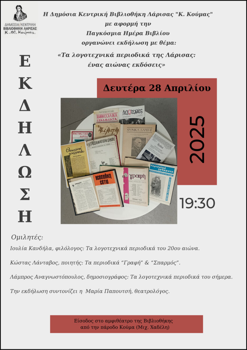 Η Δημόσια Κεντρική Βιβλιοθήκη Λάρισας «Κ. Κούμας» τιμά την Παγκόσμια Ημέρα Βιβλίου και οργανώνει εκδήλωση με θέμα: Τα λογοτεχνικά περιοδικά της Λάρισας: ένας αιώνας εκδόσεις.