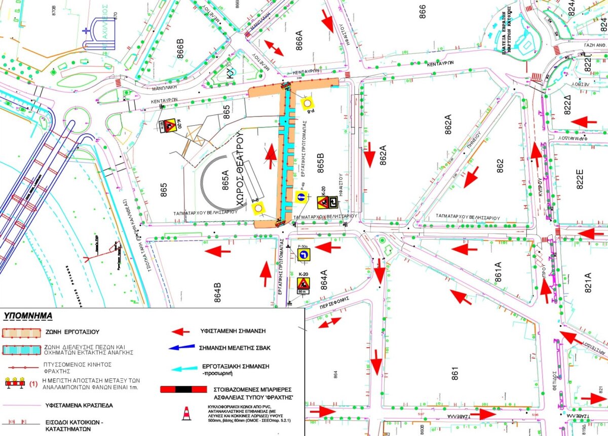 Κατά τη διάρκεια των εργασιών, η κυκλοφορία των οχημάτων στις οδούς Ηφαίστου και Εργατικής Πρωτομαγιάς,και στις κάθετες οδούς αυτών, θα διεξάγεται σύμφωνα με τις προβλεπόμενες πληροφοριακές και ρυθμιστικές πινακίδες που θα τοποθετηθούν από τον ανάδοχο του έργου.Οι ρυθμίσεις που θα ισχύσουν στην ευρύτερη περιοχή εμφανίζονται στα παρακάτω αποσπάσματα: