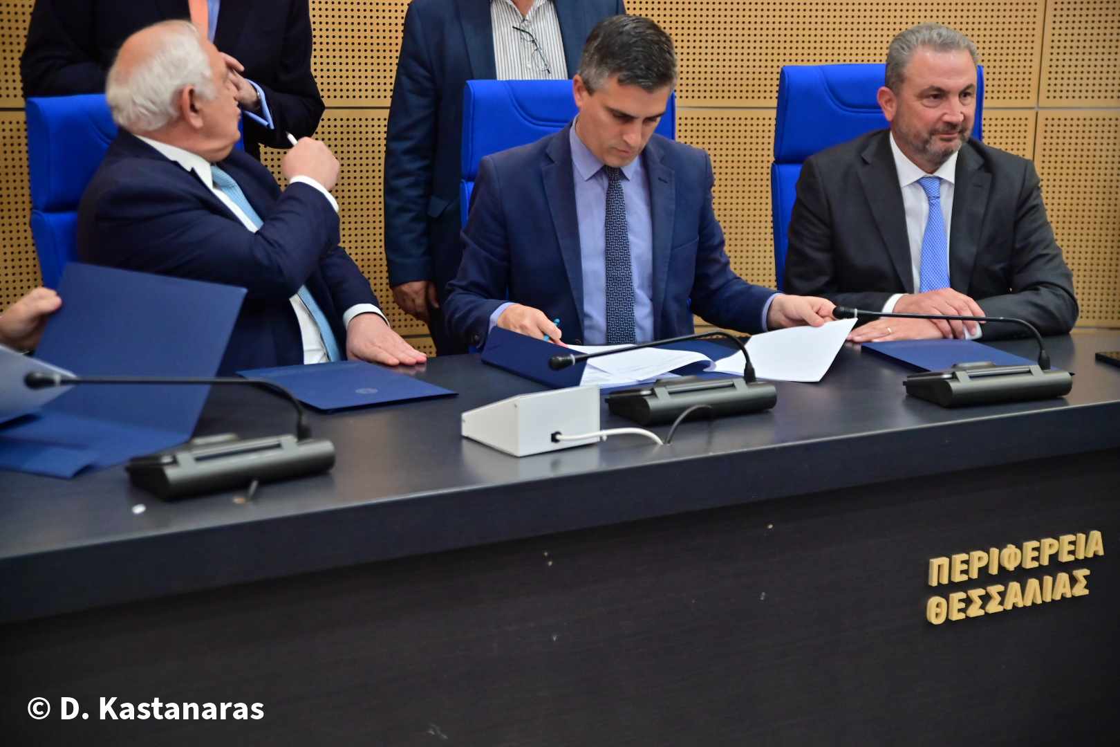 Πραγματοποιήθηκε το μεσημέρι της Τρίτης η υπογραφή των συμβάσεων, για τα έργα αποκατάστασης των ζημιών στο οδικό δίκτυο που προκάλεσαν οι κακοκαιρίες «Daniel» και «Elias» σε Θεσσαλία και Στερεά Ελλάδα, στην αίθουσα του Περιφερειακού Συμβουλίου της Περιφέρειας Θεσσαλίας, στη Λάρισα.