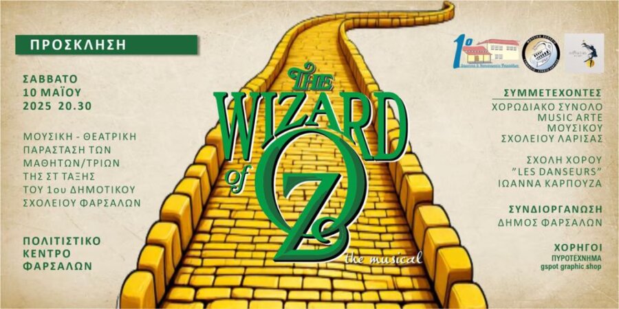 Το 1ο Δημοτικό Σχολείο Φαρσάλων, με υπερηφάνεια παρουσιάζει τη μουσική θεατρική του παράσταση “Ο Μάγος του Οζ, the Musical” μια διασκευή του αγαπημένου κλασικού παραμυθιού, που θα ανέβει στη σκηνή του Πολιτιστικού Κέντρου Φαρσάλων το Σάββατο 10 Μαΐου 2025, στις 20:30.