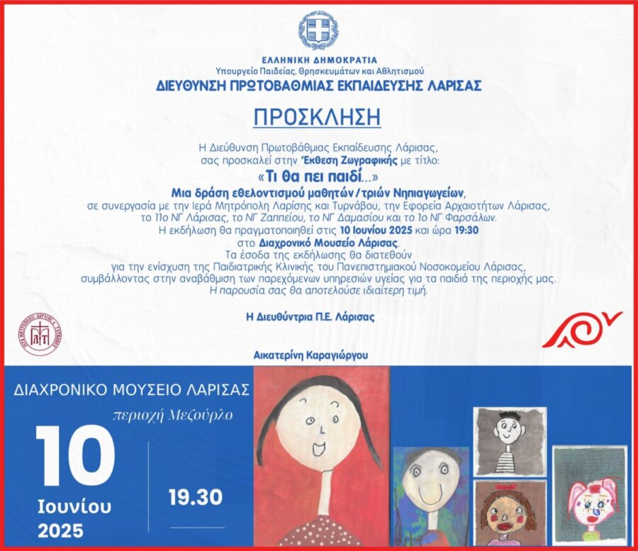 Η Διεύθυνση Πρωτοβάθμιας Εκπαίδευσης Λάρισας με ιδιαίτερη χαρά προσκαλεί την εκπαιδευτική κοινότητα και το ευρύτερο κοινό να συμμετάσχουν σε μια σημαντική Δράση με τίτλο: “Τι θα πει παιδί…”, η οποία θα πραγματοποιηθεί την Τρίτη 10 Ιουνίου 2025 και ώρα 19:30, στον χώρο του Διαχρονικού Μουσείου Λάρισας.