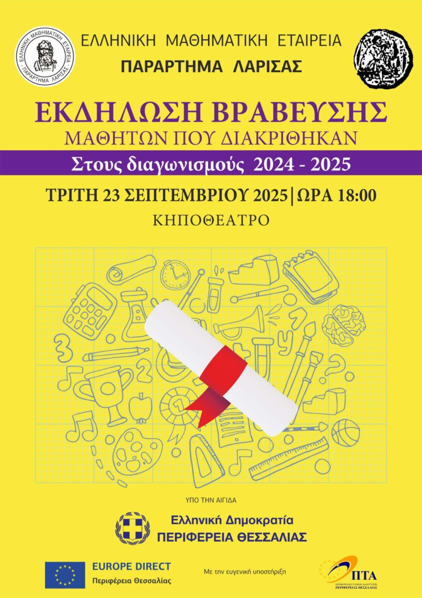 Η καθιερωμένη ετήσια πανηγυρική τελετή βράβευσης των μαθητών του νομού Λάρισας που διακρίθηκαν στους μαθηματικούς διαγωνισμούς της Ελληνικής Μαθηματικής Εταιρείας κατά το σχολικό έτος 2024-2025, θα πραγματοποιηθεί σε ανοιχτή δημόσια εκδήλωση σήμερα Τρίτη 23 Σεπτεμβρίου 2025 στο Κηποθέατρο Αλκαζάρ Λάρισας, στις 18:00.