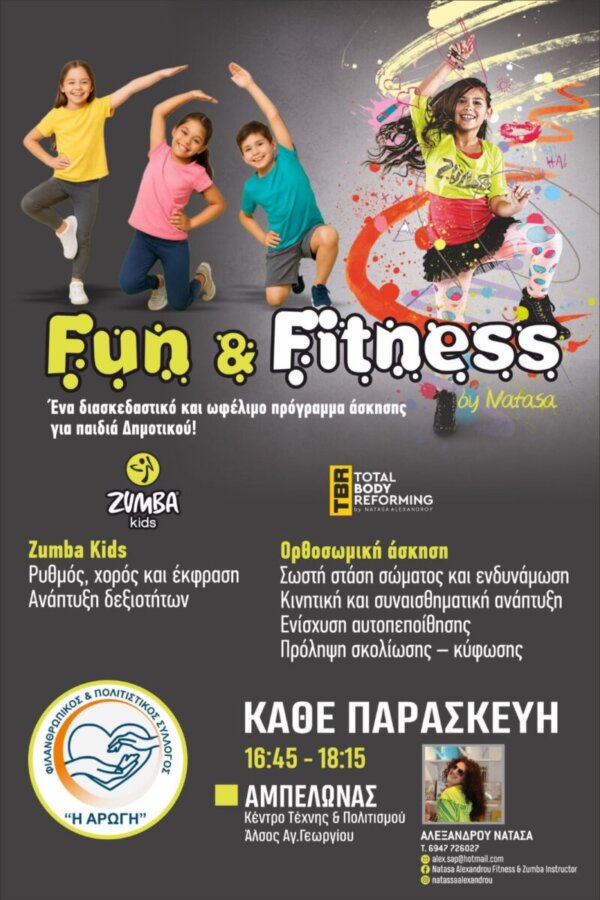 Ο Φιλανθρωπικός και Πολιτιστικός Σύλλογος «Η ΑΡΩΓΗ» Αμπελώνα βρίσκεται στην ευχάριστη θέση να ανακοινώσει την έναρξη λειτουργίας ενός πρωτοποριακού προγράμματος με τίτλο Fun & Fitness. Το πρόγραμμα είναι συνδυασμός δύο προγραμμάτων του Zumba Kinds και του Total Body Reforming (Ολική Αναμόρφωση Σώματος).