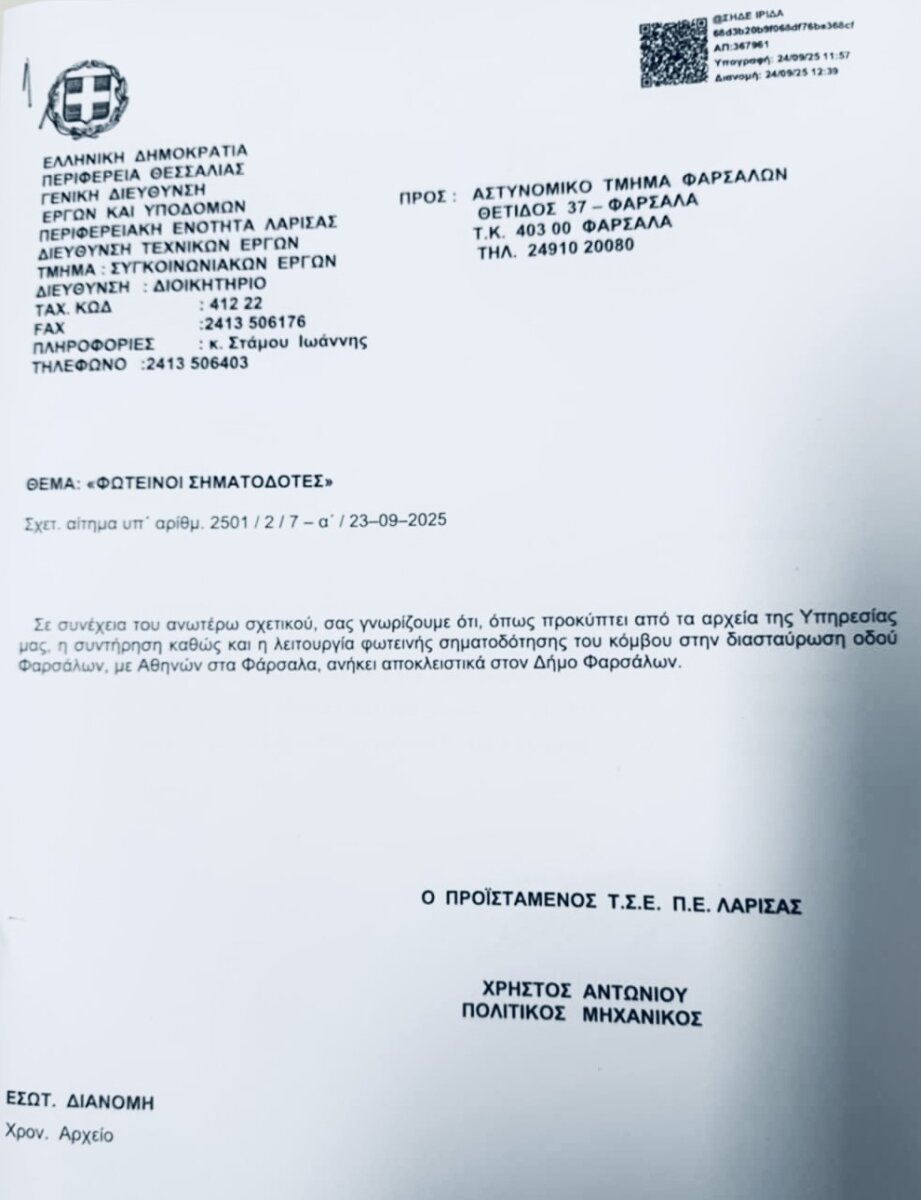 Με επίσημο έγγραφο της Περιφέρειας Θεσσαλίας (24/09/2025) ξεκαθαρίζεται πλέον ότι η συντήρηση και λειτουργία των φωτεινών σηματοδοτών ανήκει αποκλειστικά στον Δήμο Φαρσάλων. Δεν υπάρχουν άλλες δικαιολογίες, ούτε περιθώρια για μετακύλιση ευθυνών. Η ευθύνη βαραίνει αποκλειστικά τη δημοτική αρχή, η οποία άφησε έναν τόσο σημαντικό κόμβο χωρίς φωτεινή σηματοδότηση, αδιαφορώντας για την ασφάλεια των πολιτών.