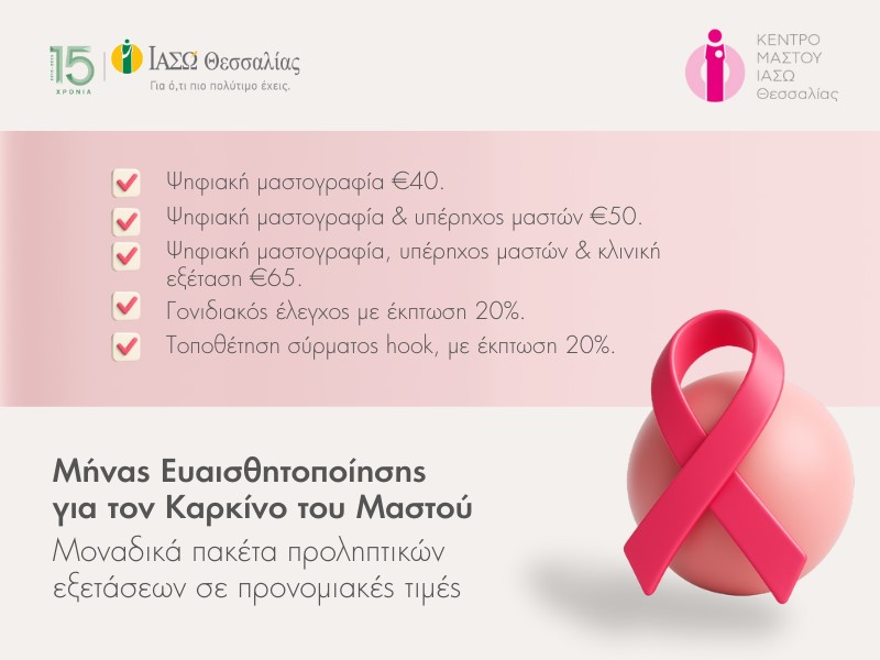 Όπως κάθε Οκτώβριο, έτσι και φέτος, με αφορμή τον Μήνα Ευαισθητοποίησης για τον Καρκίνο του Μαστού, δημιουργήσαμε ειδικά πακέτα προληπτικών εξετάσεων σε προσιτές τιμές: