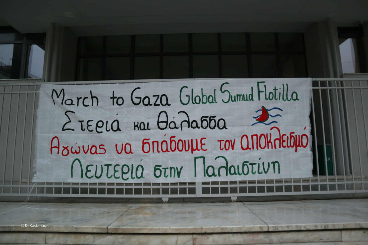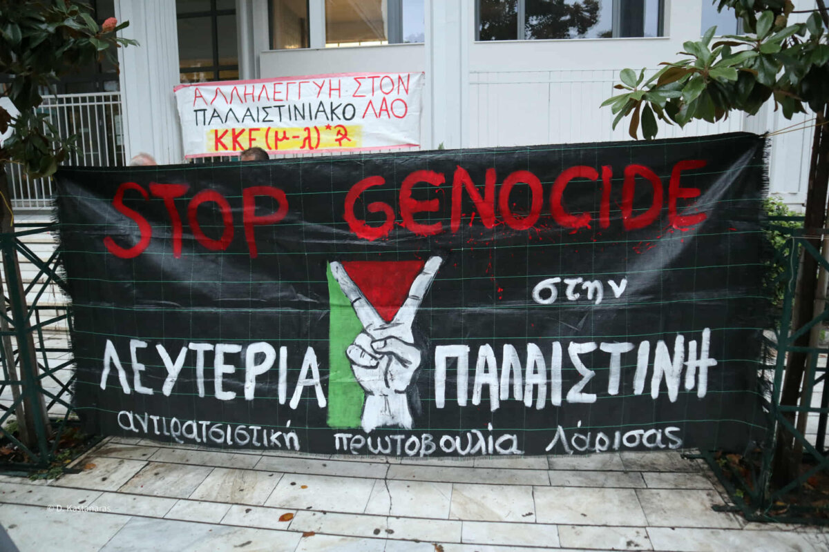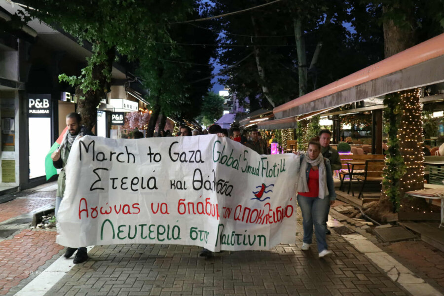 Συγκέντρωση αλληλεγγύης στον στόλο του Global Sumud Flotilla και τον Παλαιστινιακό λαό πραγματοποιήθηκε το απόγευμα της Πέμπτης, στην κεντρική πλατεία της Λάρισας.