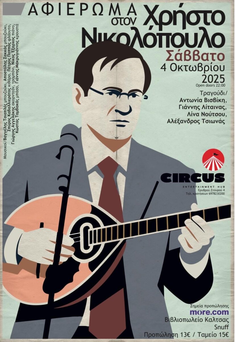 Το Σάββατο 4 Οκτωβρίου θα παρουσιαστεί στο Circus ένα αφιέρωμα στον συνθέτη Χρήστο Νικολόπουλο, τιμώντας έτσι έναν συνθέτη που συνεργάστηκε με τους σπουδαιότερους στιχουργούς, αλλά και τις μεγαλύτερες φωνές του λαϊκού πενταγράμμου και μας χαρίζει έως και σήμερα τεράστιες επιτυχίες!