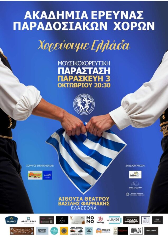 Ο Δήμος Ελασσόνας τιμά την παράδοση και τον πολιτισμό στηρίζοντας τη μεγάλη μουσικοχορευτική παράσταση «Χορεύουμε Ελλάδα», που θα παρουσιαστεί την Παρασκευή 3 Οκτωβρίου 2025 και ώρα 20:30 στην Αίθουσα Θεάτρου «Δημάρχου Βασ. Φαρμάκη», στο πλαίσιο των εκδηλώσεων «ΕΛΕΥΘΕΡΙΑ 2025», από την Ακαδημία Έρευνας Παραδοσιακών Χορών, με τη συνδιοργάνωση της Περιφέρειας Θεσσαλίας και της Π.Ε.Δ Θεσσαλίας.