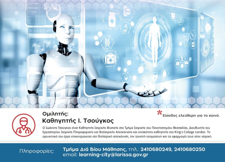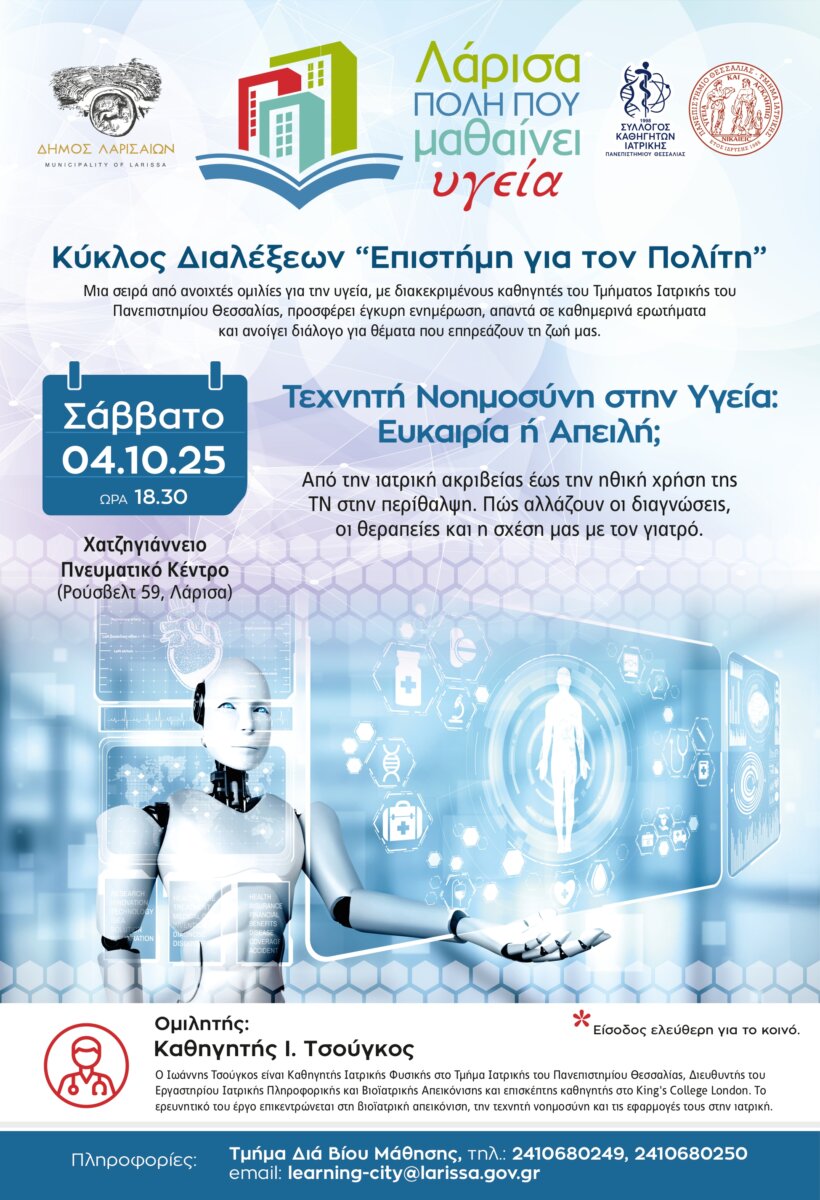 Η πρώτη διάλεξη με θέμα: «Τεχνητή Νοημοσύνη στην Υγεία: Ευκαιρία ή Απειλή;» θα πραγματοποιηθεί σήμερα Σάββατο 4 Οκτωβρίου, ώρα 6:30 μ.μ.