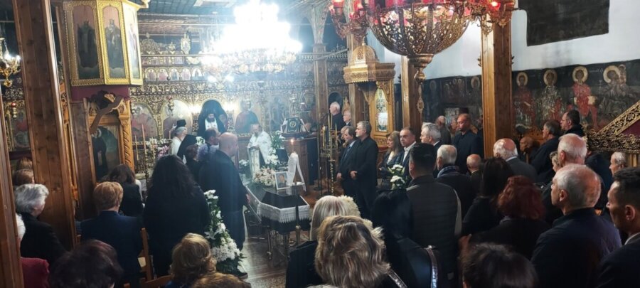 Πλήθος κόσμου, τόσο από την κωμόπολη, όσο και από την ευρύτερη περιοχή, όπως και από τη Λάρισα, αλλά και από τα Ριζώματα Ημαθίας, τόπο καταγωγής του, παρευρέθηκε στην νεκρώσιμη ακολουθία, η οποία τελέσθηκε στον ενοριακό Ιερό Ναό Αγίου Γεωργίου από τον ηγούμενο της Ιεράς Μονής Αγίου Παντελεήμονος Αγιάς, αρχιμανδρίτη π. Νικόδημο Αγαθονίκου, τον αρχιερατικό επίτροπο της Αρχιερατικής Περιφέρειας Αγιάς, πρωτοπρεσβύτερο π. Αθανάσιο Μακρή, τον εφημέριο του Ναού π. Νικόλαο Κομνηνό και άλλους ιερείς και ιερομόναχους της περιοχής.
