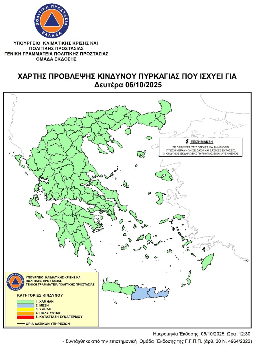 Στη δημοσιότητα έδωσε η Περιφέρεια Θεσσαλίας την πρόγνωση του καιρού για σήμερα Δευτέρα αλλά και τον χάρτη επικινδυνότητας Πυρκαγιάς: