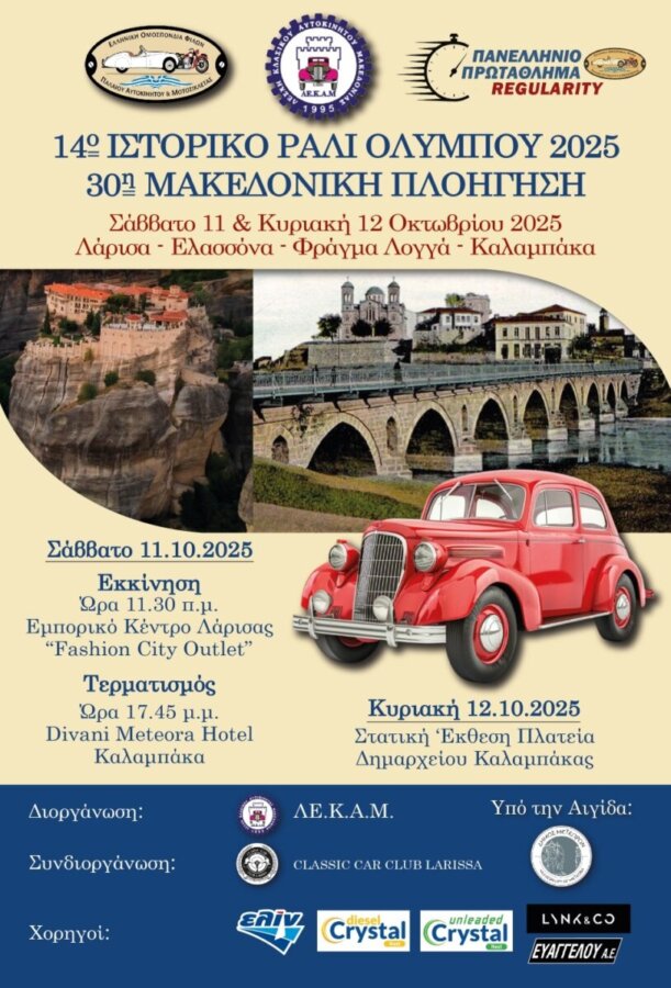 Από τη Λάρισα θα ξεκινήσει το Σάββατο 11 Οκτωβρίου το «14ο Ιστορικό Ράλι Ολύμπου 2025–30ή Μακεδονική Πλοήγηση ΛΕΚΑΜ» και θα κατευθυνθεί προς Ελασσόνα, Φράγμα Λογγά και Καλαμπάκα.