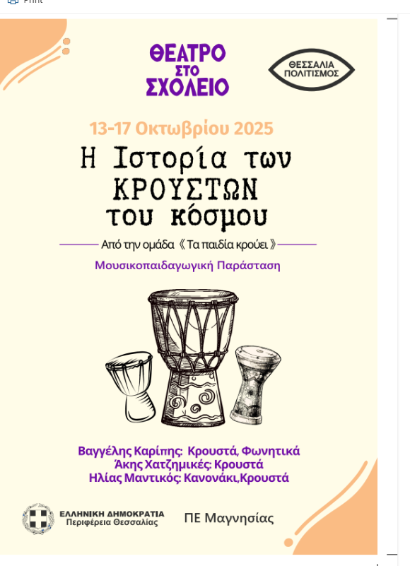 Η Περιφέρεια Θεσσαλίας υποστηρίζει με θέρμη τις πολιτιστικές δράσεις για παιδιά και σχεδιάζει με συνέπεια εξαιρετικής ποιότητας εκδηλώσεις. Στο πλαίσιο αυτό, η ομάδα «Τα Παιδία Κρούει», που αποτελείται από διεθνούς εμβέλειας μουσικούς, παρουσιάζει την Ιστορία των Κρουστών του Κόσμου για σχολεία στην Π.Ε. Μαγνησίας.