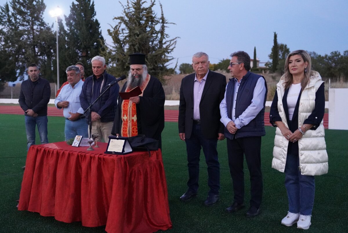 Μετά το πέρας της τελετής ο Δήμαρχος απένειμε τιμητική πλακέτα στον γυμναστή Θεοφάνη Κουλιόπουλο ο οποίος οραματίστηκε και πρωτοστάτησε πριν από χρόνια στην κατασκευή του γηπέδου.