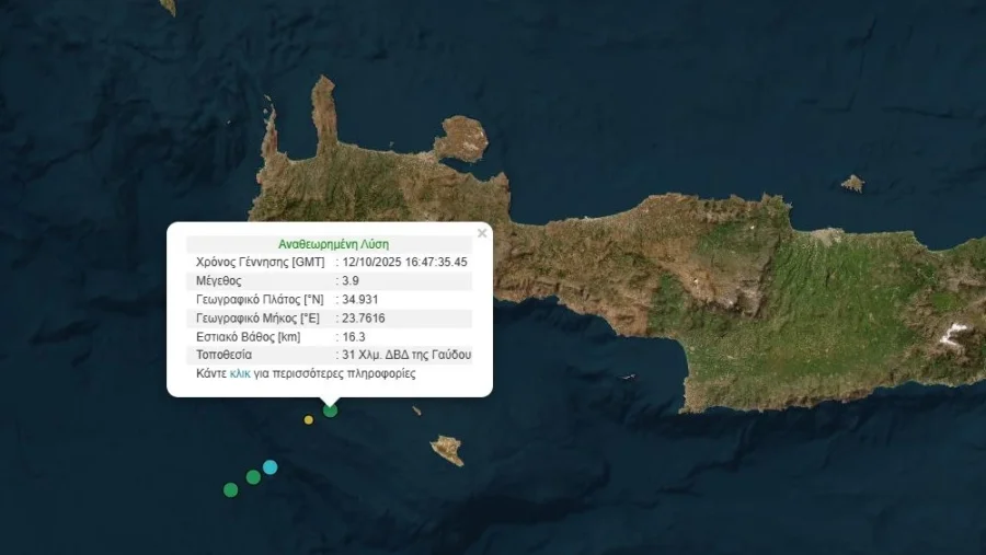 Σεισμική δόνηση μεγέθους 3,9 βαθμών της Κλίμακας Ρίχτερ σημειώθηκε στις 19:47 το απόγευμα της Κυριακής (12/10) στην θαλάσσια περιοχή νότια της Κρήτης.