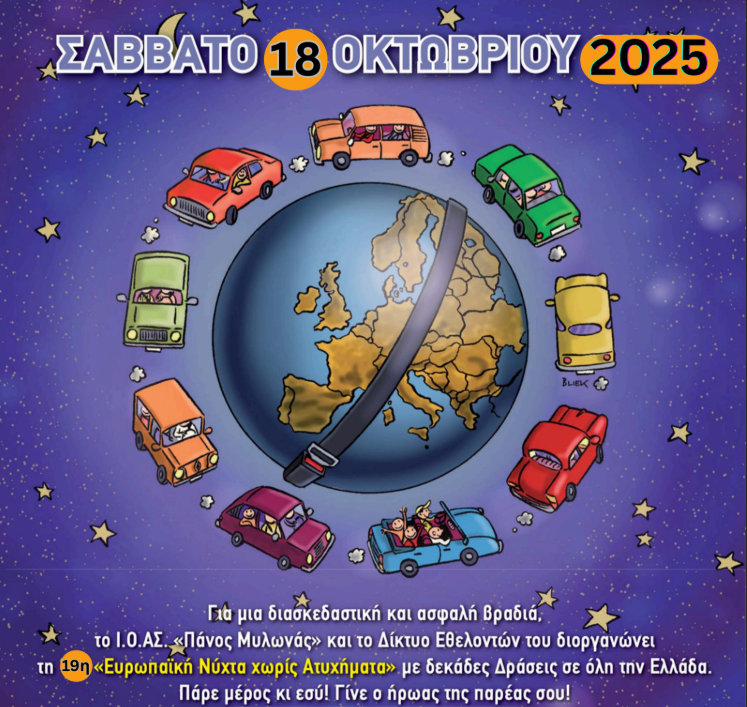 Τις δυνάμεις τους ενώνουν Δήμος Λαρισαίων, Δημοτικό Συμβούλιο Νεολαίας και Ινστιτούτο Οδικής Ασφάλειας (Ι.Ο.ΑΣ.) «Πάνος Μυλωνάς» για την υλοποίηση της δράσης «Νύχτα χωρίς Ατυχήματα» στη Λάρισα, το βράδυ του Σαββάτου, 18 Οκτωβρίου.