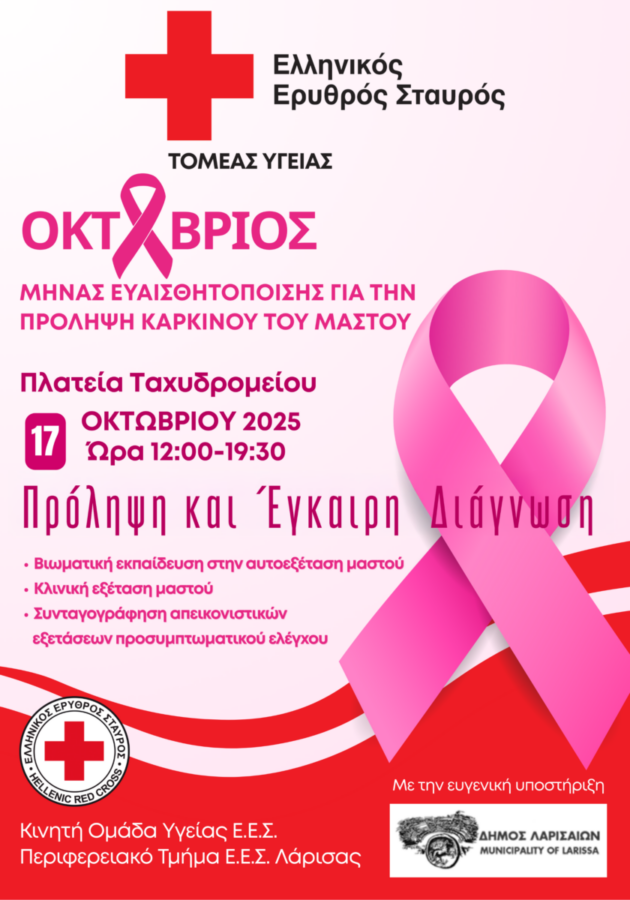 Ο Ελληνικός Ερυθρός Σταυρός, θα συμμετέχει ενεργά στην ενημερωτική και εορταστική εκδήλωση του Συλλόγου Καρκινοπαθών Λάρισας, αφιερωμένη στην πρόληψη του καρκίνου του μαστού, η οποία θα πραγματοποιηθεί την Παρασκευή 17 Οκτωβρίου, στις 19:30, στον υπαίθριο χώρο μπροστά από το κτίριο Κατσίγρα της Ιατρικής Σχολής, στην Πλατεία Ταχυδρομείου Λάρισας.