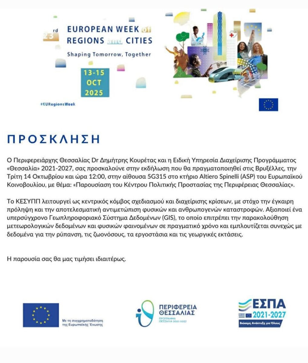 Στις Βρυξέλλες βρίσκεται ο Περιφερειάρχης Θεσσαλίας Δημήτρης Κουρέτας όπου σήμερα θα παρουσιάσει σε Έλληνες και ξένους ευρωβουλευτές το Κέντρο Πολιτικής Προστασίας που δημιουργήθηκε πρόσφατα στην Περιφέρεια.