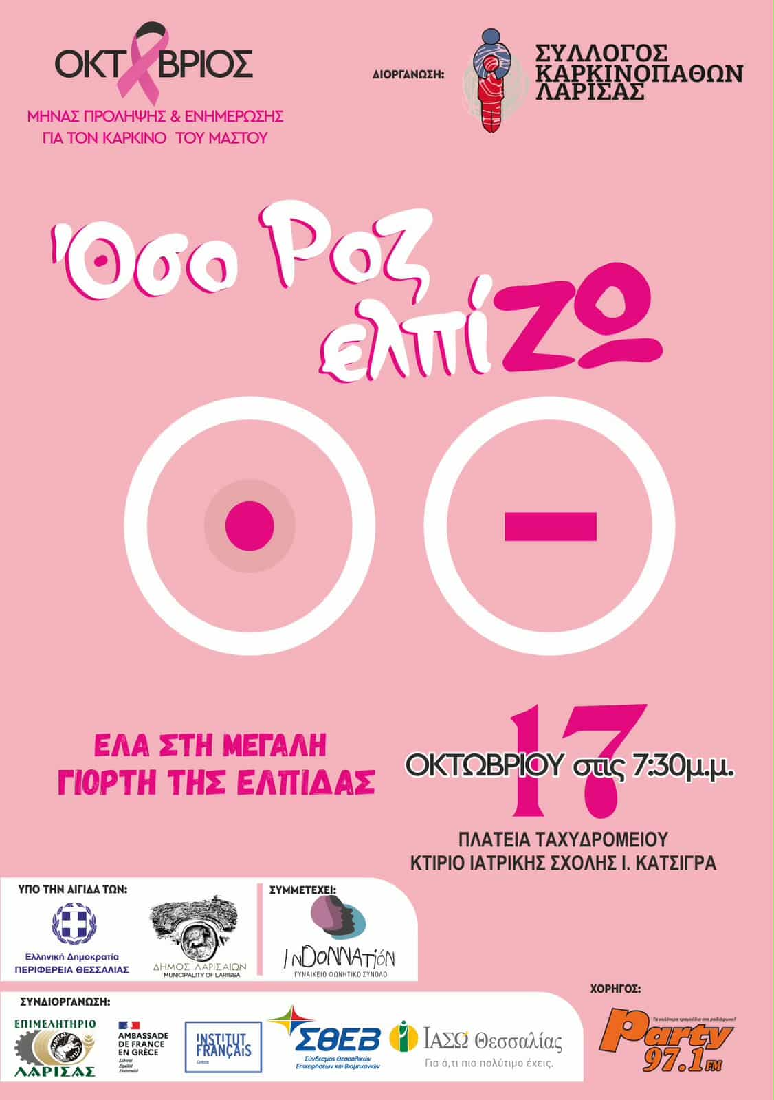 Παράλληλα, η Λάρισα στέλνει το δικό της μήνυμα ζωής και ελπίδας, μέσα από την πρωτοβουλία «Όσο ΡΟΖ ελπίΖΩ», αύριο, Παρασκευή 17 Οκτωβρίου, στις 19:30, στον υπαίθριο χώρο μπροστά από το κτίριο Κατσίγρα της Ιατρικής Σχολής.