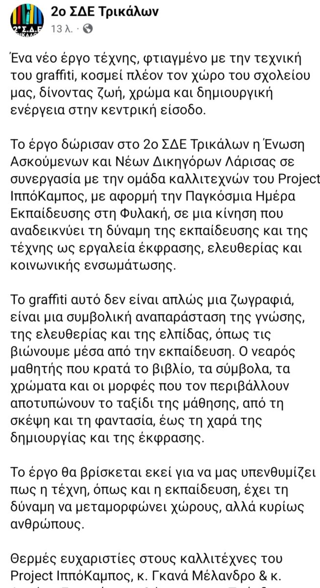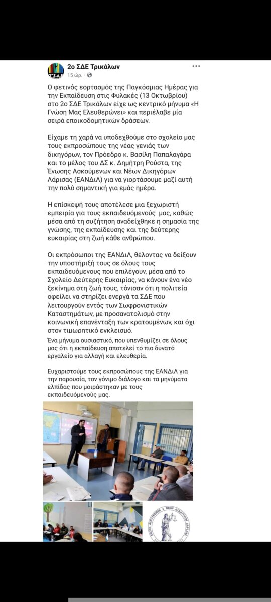 Κλείνοντας, ευχαριστούμε θερμά τον Διευθυντή Δομών Εκπαίδευσης και Κατάρτισης στο Σωφρονιστικό Κατάστημα Τρικάλων και Διευθυντή του 2ου Σχολείου Δεύτερης Ευκαιρίας Τρικάλων κ. Θεοφάνη Κατσάνο, όπως και όλη την ομάδα των εκπαιδευτικών του 2ου ΣΔΕ Τρικάλων, για τη ζέστη υποδοχή και την αγαστή συνεργασία”.