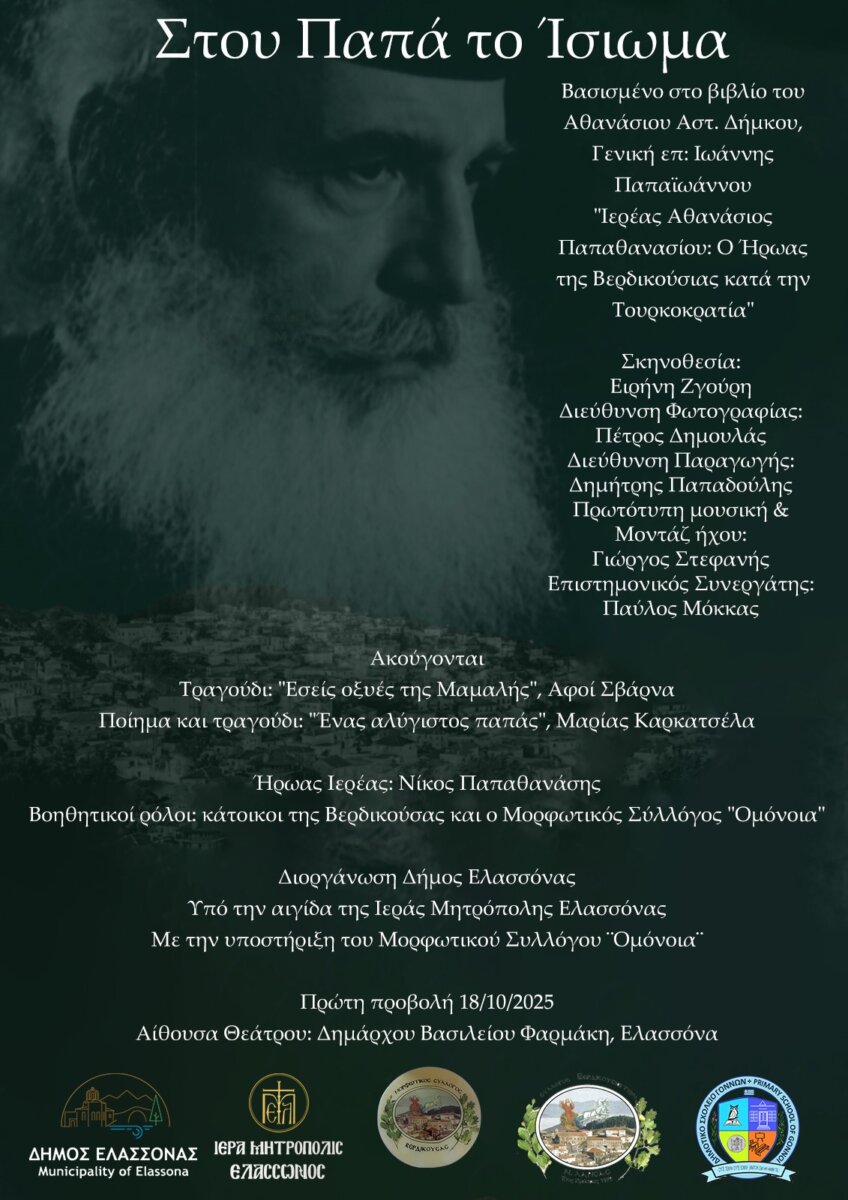 Ο Δήμος Ελασσόνας, υπό την αιγίδα της Ιεράς Μητροπόλεως Ελασσόνας, διοργανώνει την προβολή της ταινίας «Στου Παπά το Ίσιωμα», το Σάββατο 18 Οκτωβρίου 2025 και ώρα 19:00, στην Αίθουσα Θεάτρου «Δημάρχου Βασιλείου Φαρμάκη» στην Ελασσόνα.