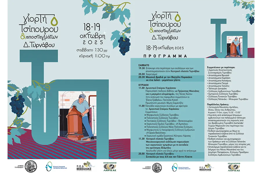 Ο Τύρναβος, η ιστορική «καρδιά» της αποσταγματοποιίας στη Θεσσαλία, ετοιμάζεται να υποδεχτεί και φέτος τη Γιορτή Τσίπουρου, το Σαββατοκύριακο 18 και 19 Οκτωβρίου 2025. Πρόκειται για έναν θεσμό που τιμά την τοπική παράδοση της απόσταξης και συγκεντρώνει κάθε χρόνο πλήθος επισκεπτών από όλη την Ελλάδα.