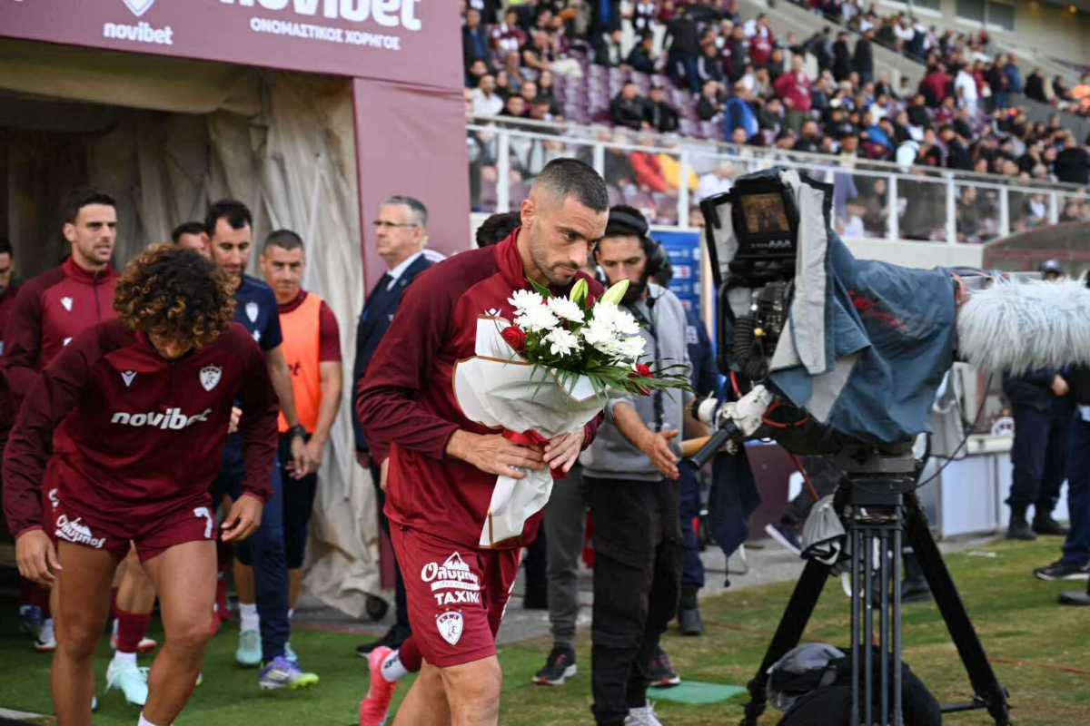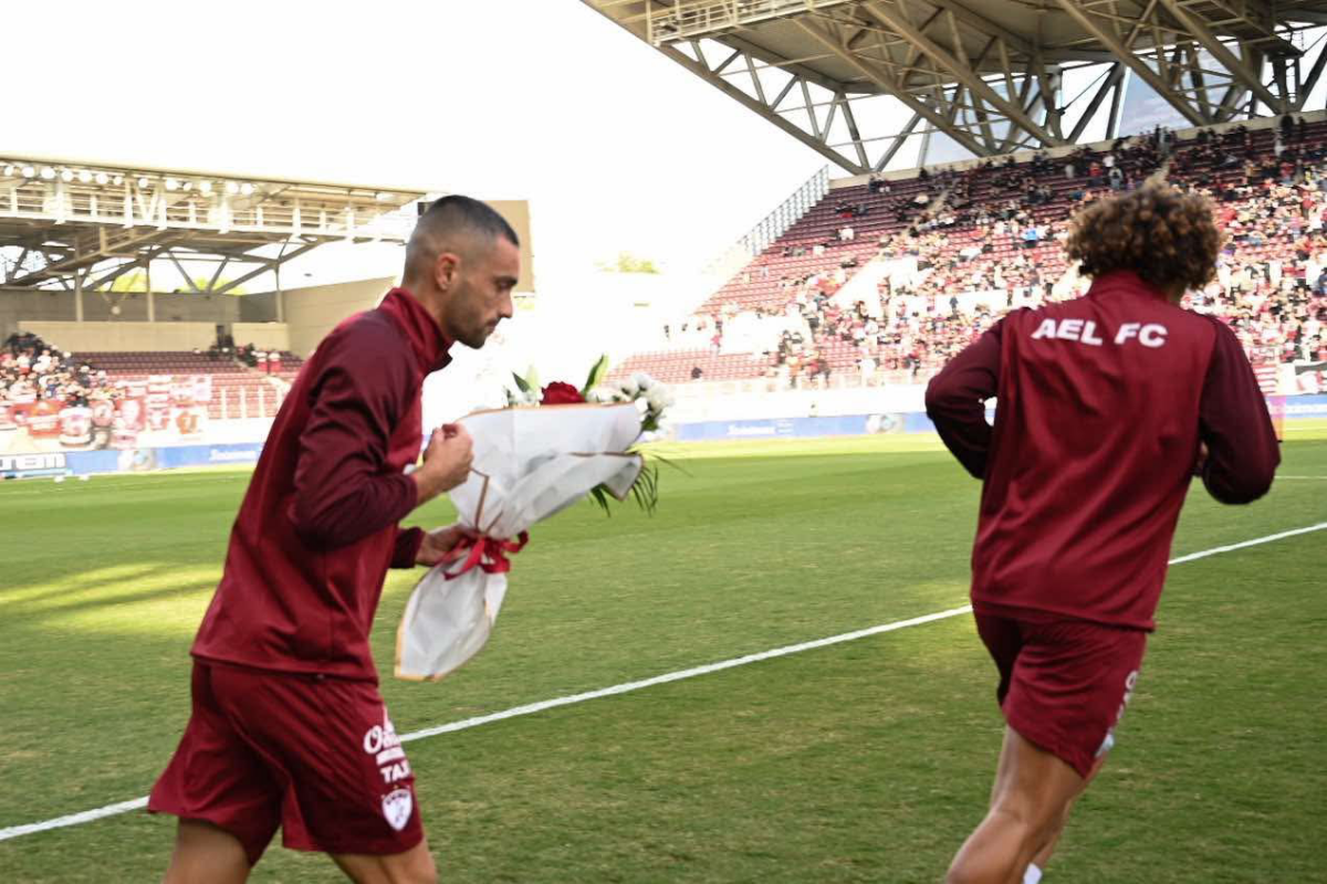 Με ανθοδέσμη στα χέρια έκαναν την εμφάνισή τους στον αγωνιστικό χώρο οι παίκτες της ΑΕΛ, ενώ σε μια γωνιά του γηπέδου και δίπλα στο «πέταλο» οργανωμένοι της Θ1 είχαν τοποθετήσει τη φωτογραφία του, όπως και στεφάνι, την ώρα που στον πίνακα του γηπέδου εμφανιζόταν σχετικό αποχαιρετιστήριο μήνυμα.