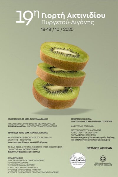 Η πλατεία της Αιγάνης θα γεμίσει με κόσμο που θα γιορτάσει τον καρπό που χαρακτηρίζει την περιοχή, σε μια εκδήλωση γεμάτη γεύσεις, παράδοση και ζωντάνια. Η 19η Διήμερη Γιορτή Ακτινιδίου αναμένεται να αφήσει αξέχαστες στιγμές σε όλους τους επισκέπτες.
