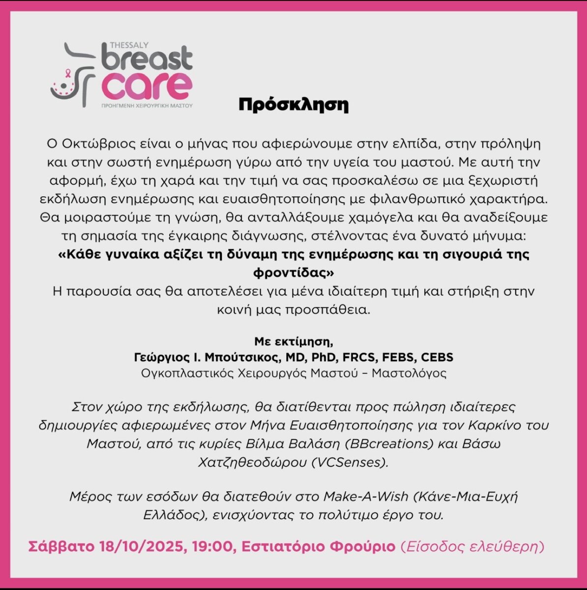 Με αυτή την παραδοχή, ο Ογκοπλαστικός Χειρουργός Μαστού – Μαστολόγος, Γεώργιος Ι. Μπούτσικος (MD, PhD, FRCS, FEBS, CEBS), διοργανώνει μια ξεχωριστή φιλανθρωπική εκδήλωση ενημέρωσης και ευαισθητοποίησης, σήμερα Σάββατο 18 Οκτωβρίου 2025, στις 7 το απόγευμα, στο Φρούριο της Λάρισας.