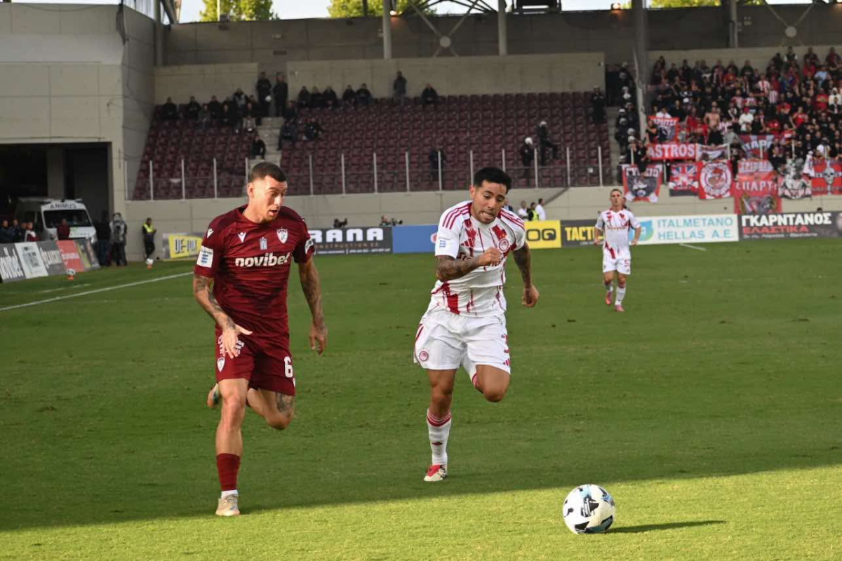 Στο 21’ και με τους «βυσσινί» να προσπαθούν να βγάλουν αντίδραση η ΑΕΛ υποχρεώθηκε σε αναγκαστική αλλαγή, με τον Δεληγιαννίδη να τραυματίζεται δίνοντας τη θέση του στον Παπαγεωργίου, ενώ στην εκπνοή του ημιχρόνου ο διαιτητής καταλόγισε πέναλτι για χέρι του Κοβάτσεβιτς εντός περιοχής, με τον Ελ Κααμπί να νικά τον Μελίσσα από τα 11 βήματα σημειώνοντας το 0-2 για τον Ολυμπιακό (44’).