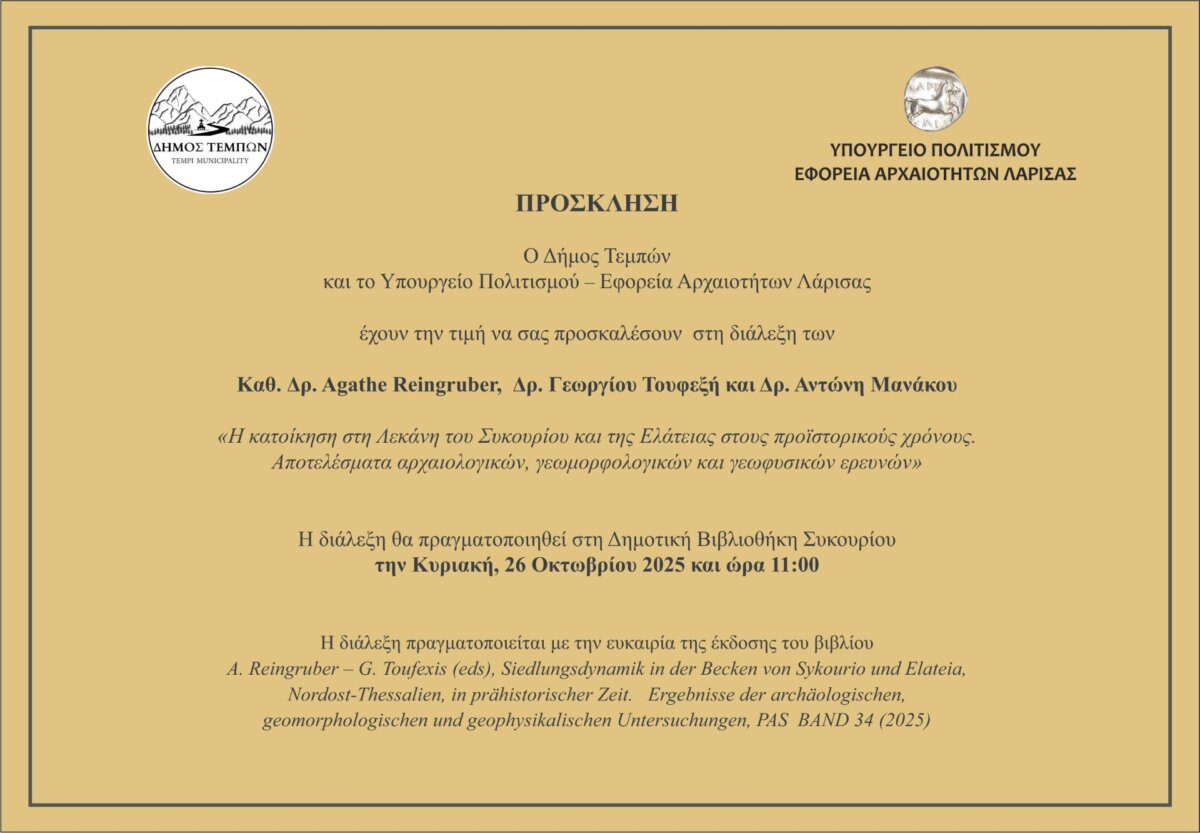 Ο Δήμος Τεμπών, σε συνεργασία με την Εφορεία Αρχαιοτήτων Λάρισας, διοργανώνει την Κυριακή 26 Οκτωβρίου 2025 και ώρα 11:00 π.μ., στη Δημοτική Βιβλιοθήκη Συκουρίου, διάλεξη με θέμα: “Η κατοίκηση στη Λεκάνη του Συκουρίου και της Ελάτειας στους προϊστορικούς χρόνους. Αποτελέσματα αρχαιολογικών, γεωμορφολογικών και γεωφυσικών ερευνών”.