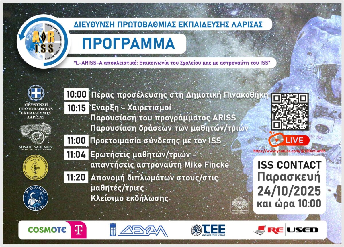 H Διεύθυνση Πρωτοβάθμιας Εκπαίδευσης Λάρισας, ο Δήμος Λαρισαίων, η Ένωση Ραδιοερασιτεχνών Θεσσαλίας και το 18ο Δημοτικό Σχολείο Λάρισας, συνδιοργανώνουν την Παρασκευή 24/10/2025, και ώρα 10:00 π.μ., στη Δημοτική Πινακοθήκη Λάρισας – Μουσείο Γ.Ι. Κατσίγρα, την ιδιαίτερη και ξεχωριστή δράση, με τίτλο: “L-ARISS-A αποκλειστικό: Επικοινωνία του σχολείου μας με αστροναύτη του ISS”, κατά την οποία μαθητές και μαθήτριες, συνομιλήσουν σε ζωντανή σύνδεση με τον Αμερικάνο αστροναύτη, Micke Fincke KE5AIT, του Διεθνούς Διαστημικού Σταθμού (ISS), στο πλαίσιο του διεθνούς προγράμματος ARISS (Amateur Radio on the International Space Station).
