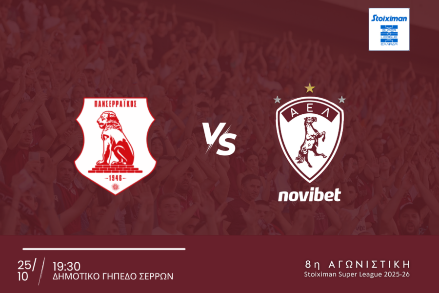 Σε συνέχεια της ενημέρωσης για τα εισιτήρια της αναμέτρησης της 8ης Αγωνιστικής της Stoiximan Super League μεταξύ Πανσερραϊκού – ΑΕΛ Novibet, η ΠΑΕ ΑΕΛ Novibet γνωστοποιεί στους φιλάθλους της ότι η διάθεση γίνεται αποκλειστικά ηλεκτρονικά μέσω του παρακάτω συνδέσμου και το κόστος ανέρχεται στα 20€ και αφορά την Θύρα 7 του Δημοτικού Γηπέδου Σερρών «Εμμανουήλ Παπάς»: