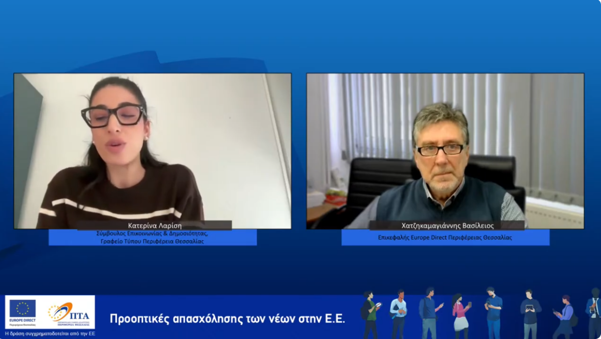 Με ιδιαίτερη επιτυχία πραγματοποιήθηκε η διαδικτυακή εκδήλωση του EUROPE DIRECT Περιφέρειας Θεσσαλίας με θέμα «Προοπτικές απασχόλησης των νέων στην Ευρωπαϊκή Ένωση», η οποία συγκέντρωσε το ενδιαφέρον πολλών συμμετεχόντων από όλη τη Θεσσαλία και άλλες περιοχές της χώρας. Η εκδήλωση στόχευε στην ενημέρωση των νέων σχετικά με τις ευκαιρίες επαγγελματικής ανάπτυξης, εκπαίδευσης και κινητικότητας που προσφέρει η Ευρωπαϊκή Ένωση, καθώς και στην προώθηση της συνεργασίας μεταξύ επιχειρήσεων, φορέων και οργανισμών για την ενίσχυση της νεανικής απασχόλησης.