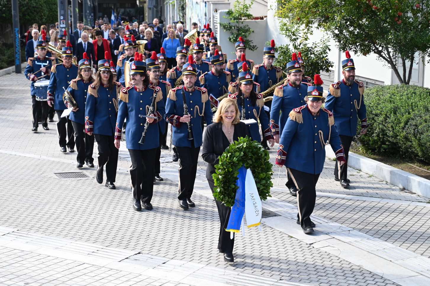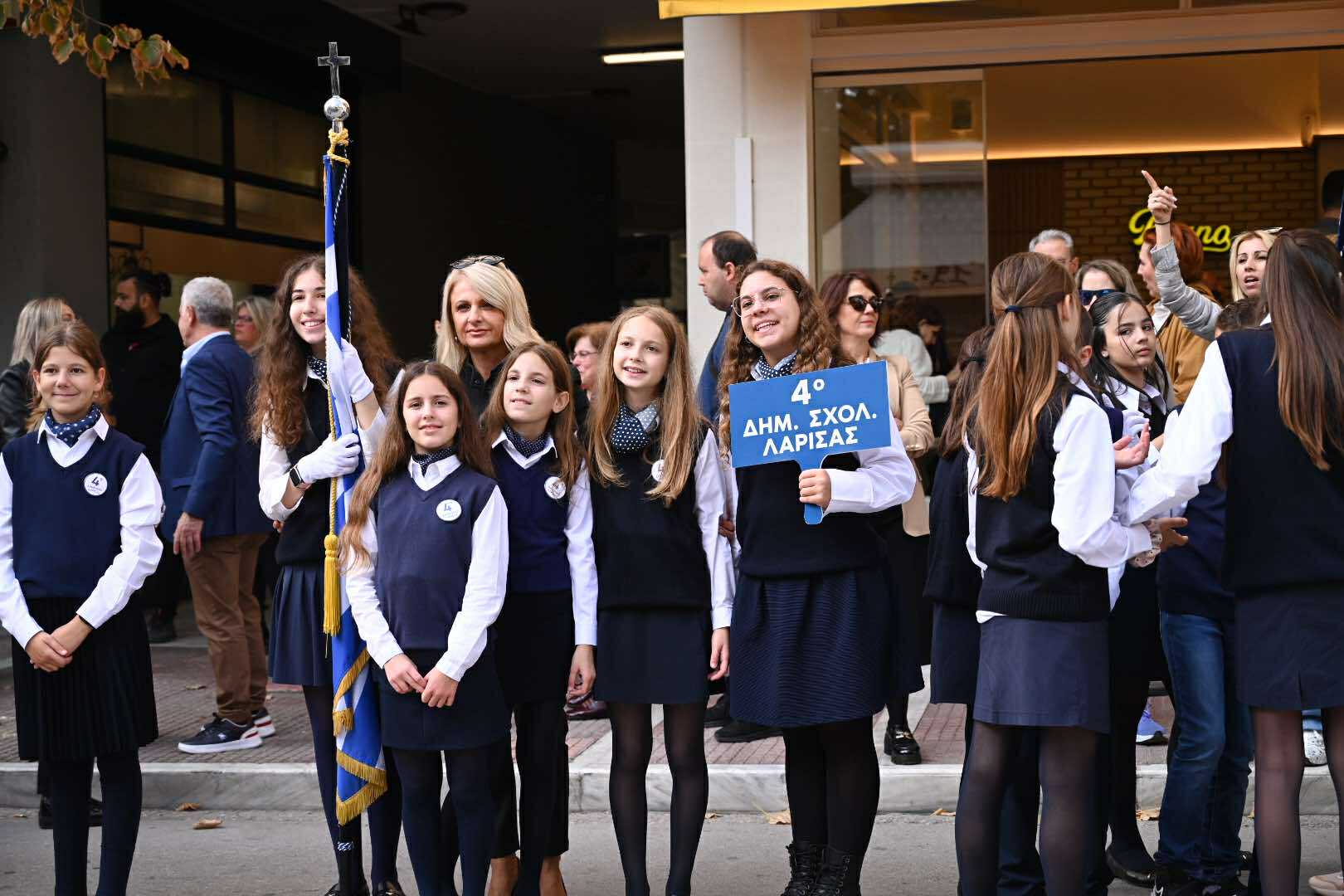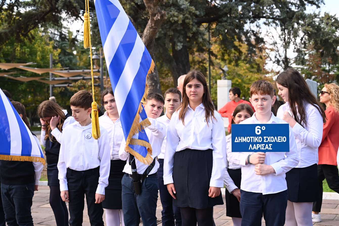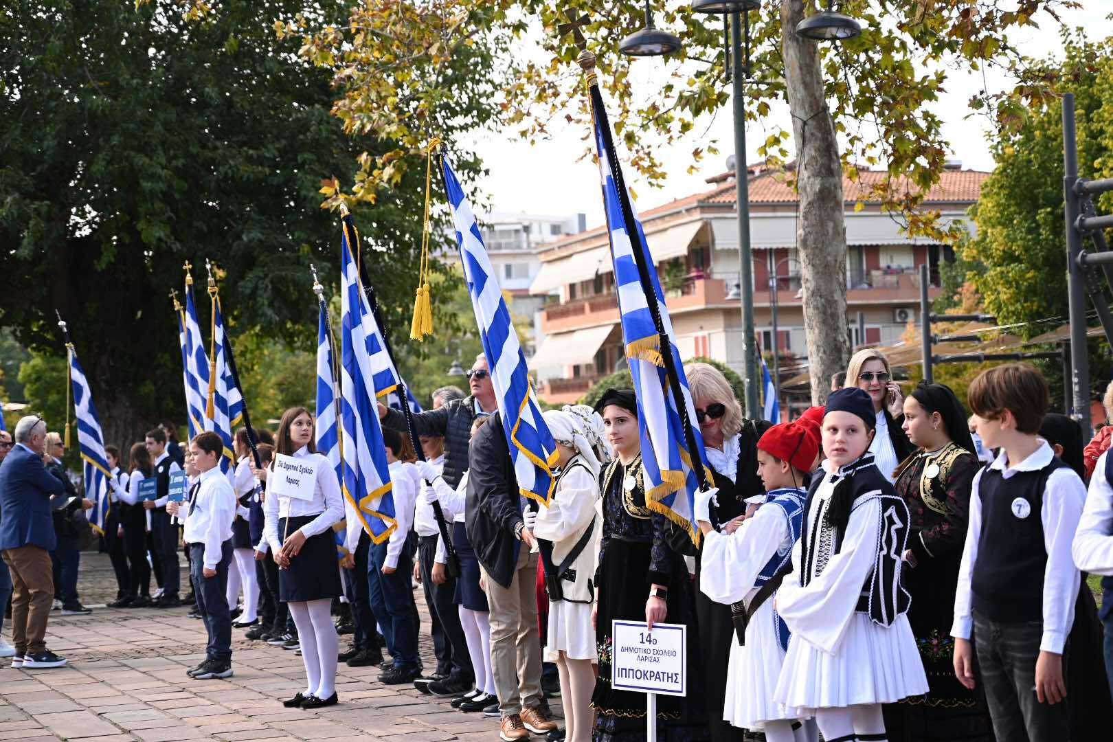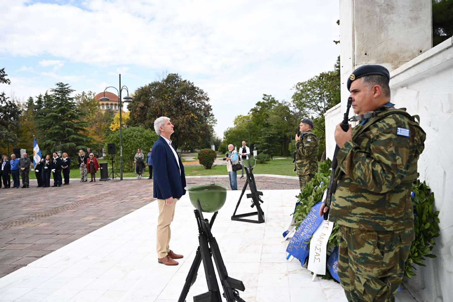 Λίγο μετά τις 11 το πρωί μαθητές εκπρόσωποι αρχών και φορέων, καθώς και πολίτες, συγκεντρώθηκαν μπροστά από το Δημαρχείο της Λάρισας και με τη Φιλαρμονική του Δήμου να προηγείται, μετακινήθηκαν προς το Ηρώο της πόλης. Εκεί, που ακολούθησε η τέλεση Επιμνημόσυνης δέησης, η ομιλία της Προέδρου του Δημοτικού Συμβουλίου, Γαρυφαλλιάς Καρυστιανού-Γκολφινοπούλου και ολοκληρώθηκαν με την κατάθεση στεφάνων.