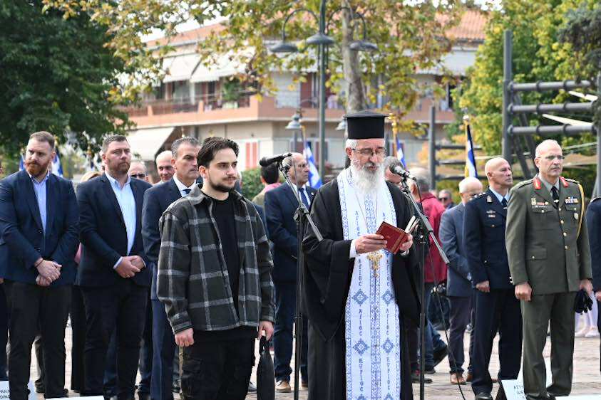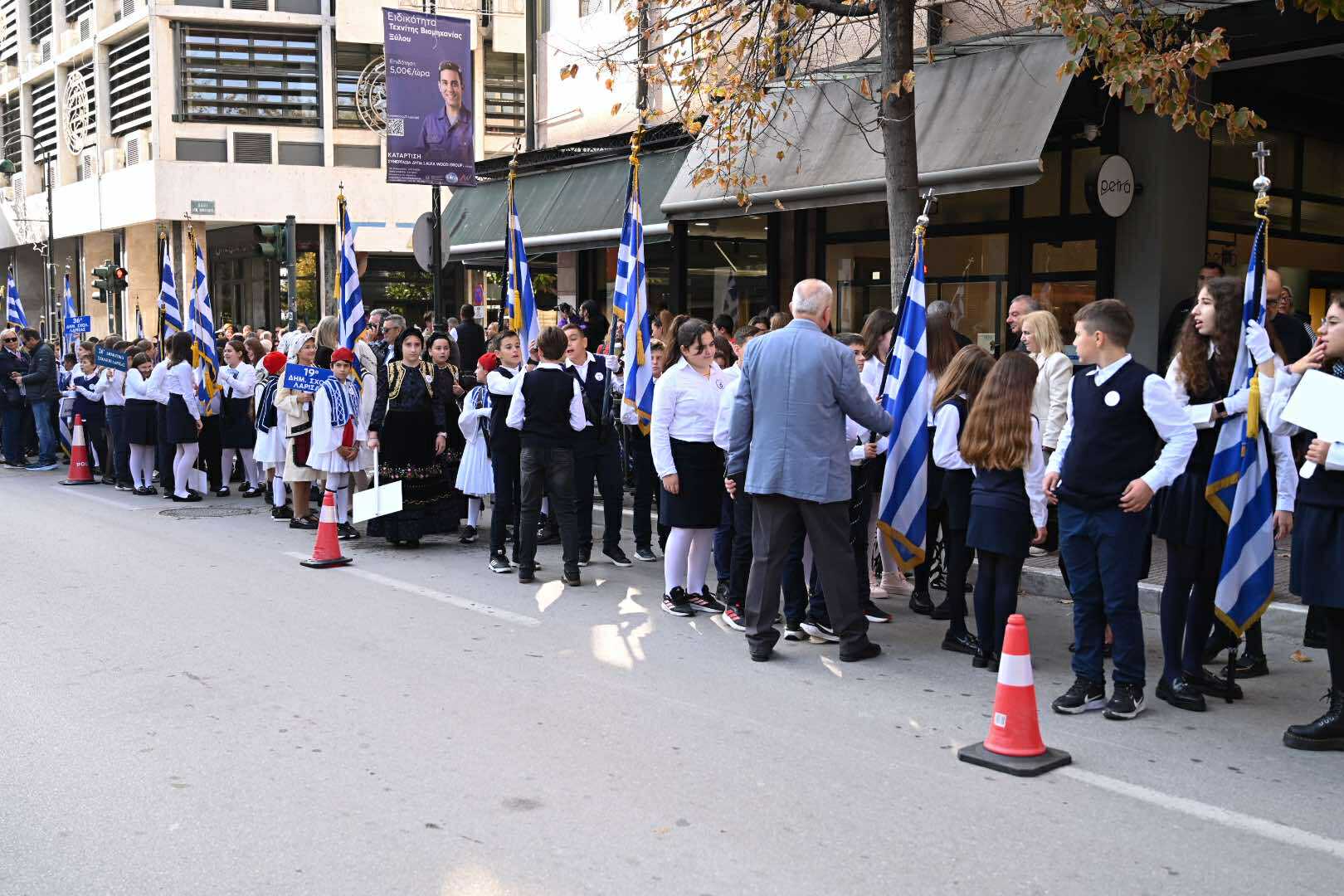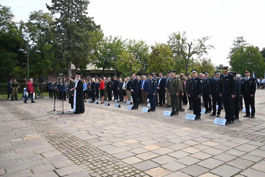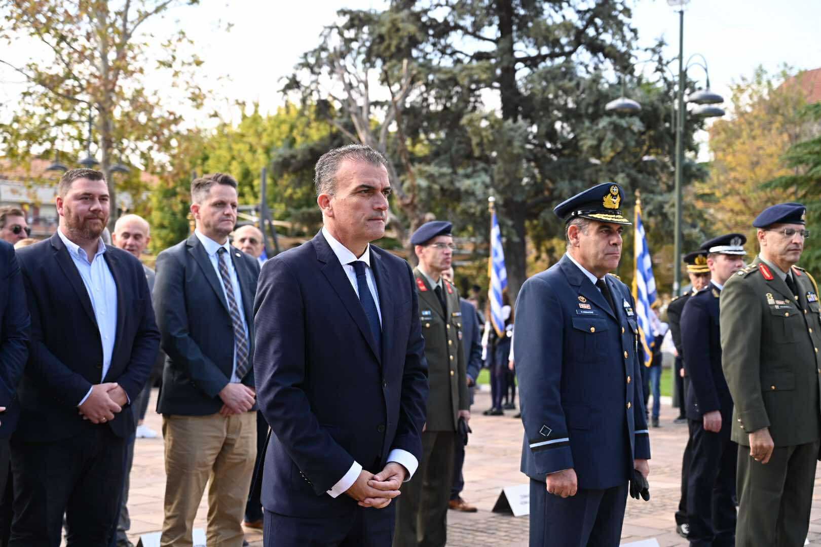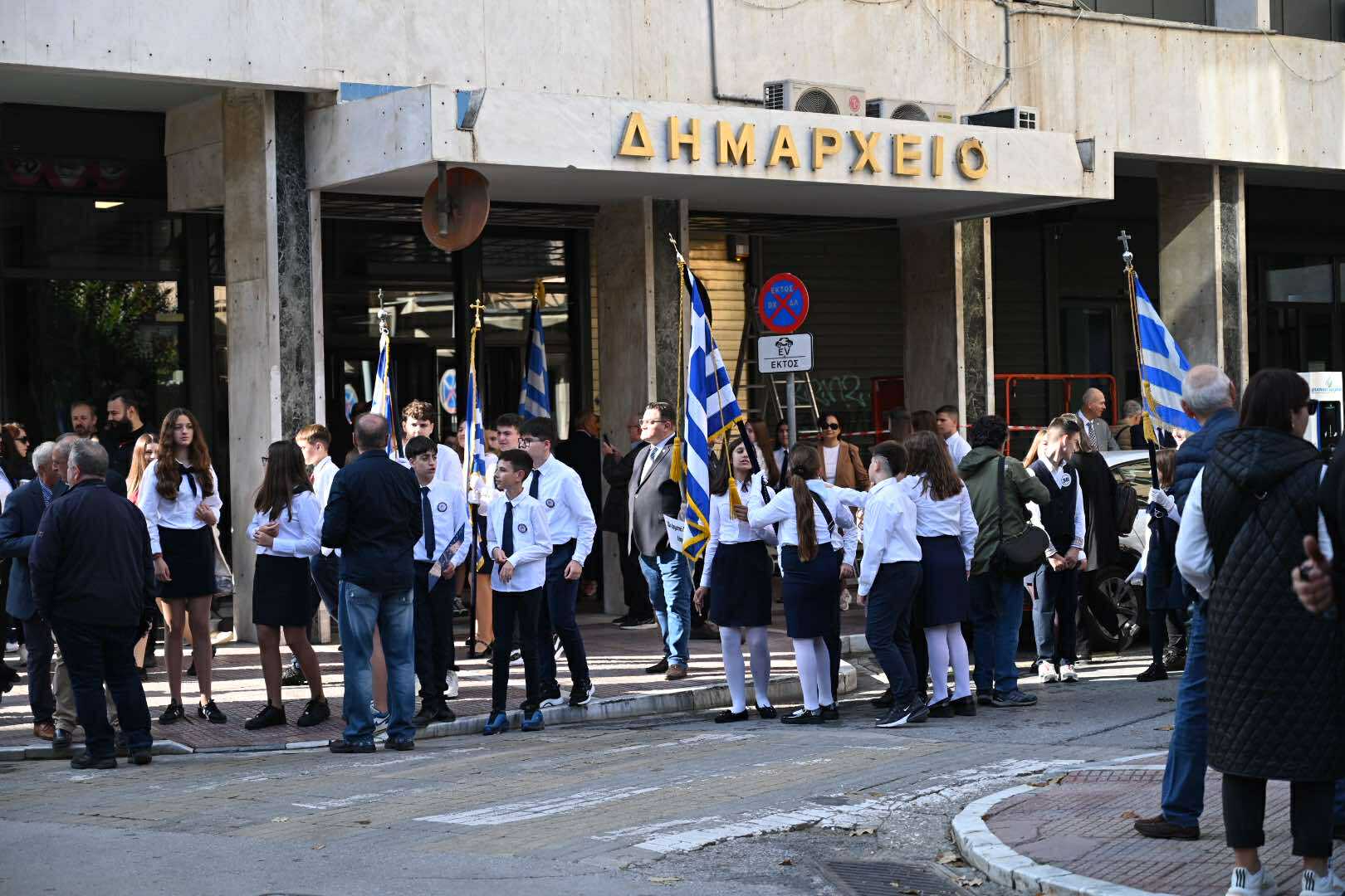 Λίγο μετά τις 11 το πρωί μαθητές εκπρόσωποι αρχών και φορέων, καθώς και πολίτες, συγκεντρώθηκαν μπροστά από το Δημαρχείο της Λάρισας και με τη Φιλαρμονική του Δήμου να προηγείται, μετακινήθηκαν προς το Ηρώο της πόλης. Εκεί, που ακολούθησε η τέλεση Επιμνημόσυνης δέησης, η ομιλία της Προέδρου του Δημοτικού Συμβουλίου, Γαρυφαλλιάς Καρυστιανού-Γκολφινοπούλου και ολοκληρώθηκαν με την κατάθεση στεφάνων.
