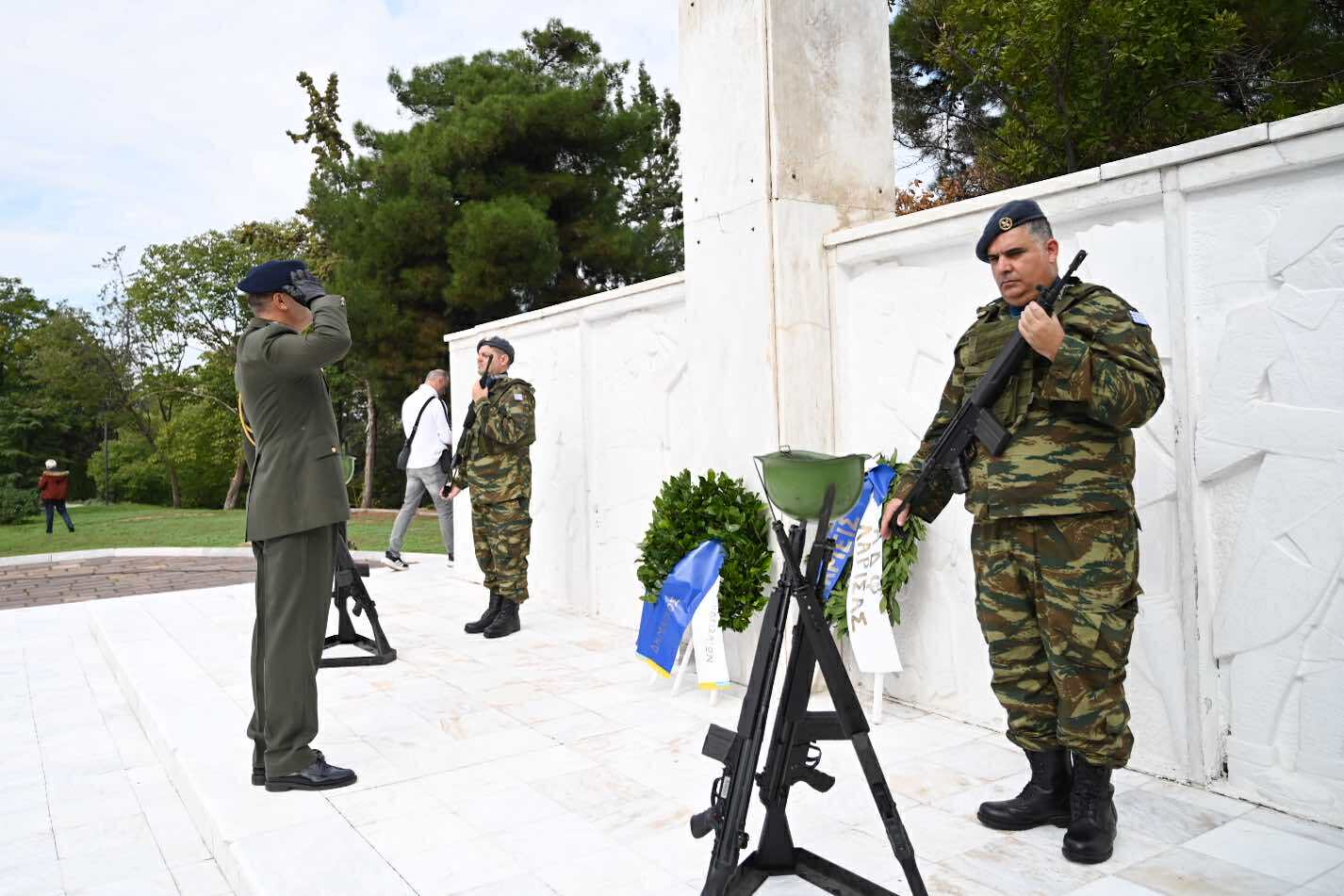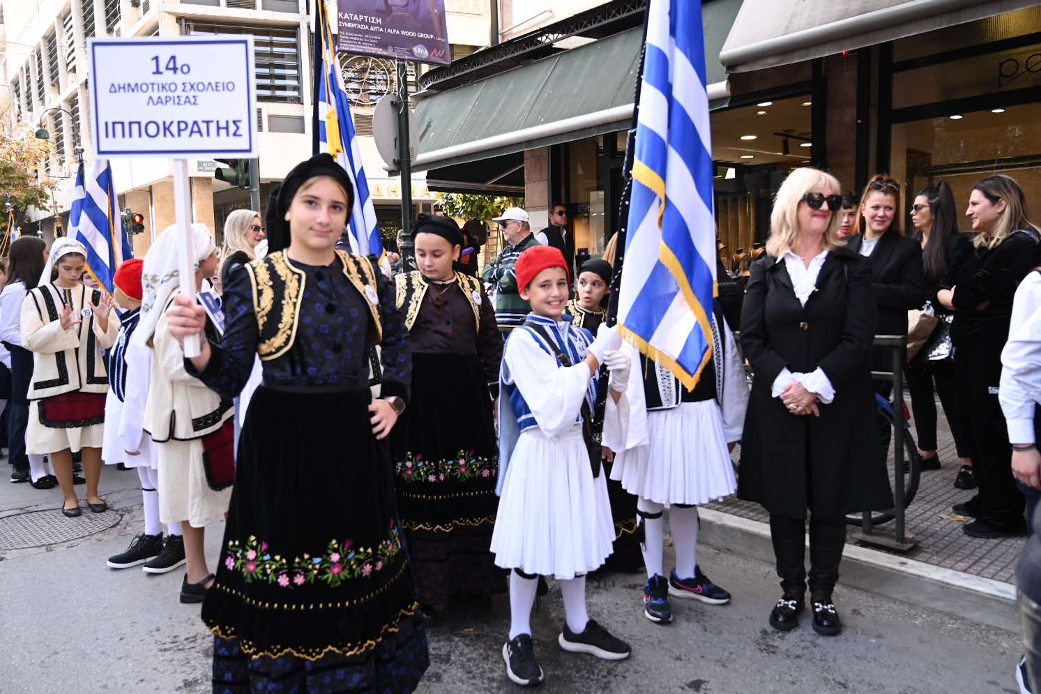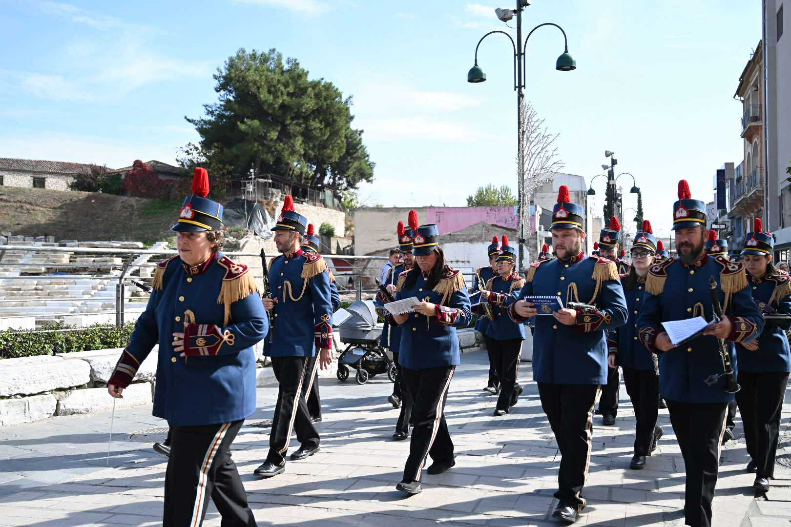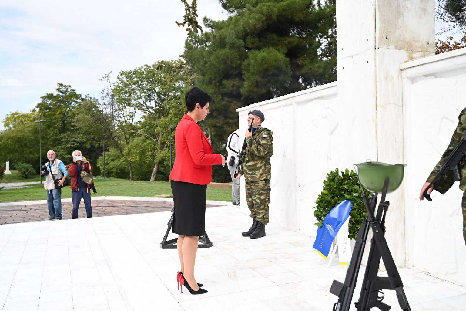Λίγο μετά τις 11 το πρωί μαθητές εκπρόσωποι αρχών και φορέων, καθώς και πολίτες, συγκεντρώθηκαν μπροστά από το Δημαρχείο της Λάρισας και με τη Φιλαρμονική του Δήμου να προηγείται, μετακινήθηκαν προς το Ηρώο της πόλης. Εκεί, που ακολούθησε η τέλεση Επιμνημόσυνης δέησης, η ομιλία της Προέδρου του Δημοτικού Συμβουλίου, Γαρυφαλλιάς Καρυστιανού-Γκολφινοπούλου και ολοκληρώθηκαν με την κατάθεση στεφάνων.
