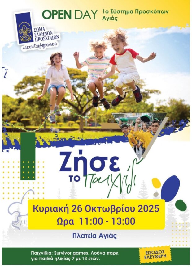 Την Κυριακή 26 Οκτωβρίου το 1ο Σύστημα Προσκόπων Αγιάς προσκαλεί όλα τα παιδιά να συμμετέχουν σε παιχνίδια και δραστηριότητες ώστε να γνωρίσουν τον προσκοπισμό και να ζήσουν στιγμές χαράς και διασκέδασης.