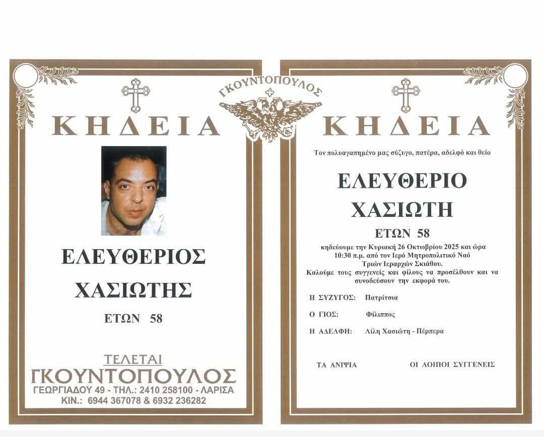 Έφυγε από τη ζωή ο Λευτέρης Χασιώτης σε ηλικία 58 ετών.