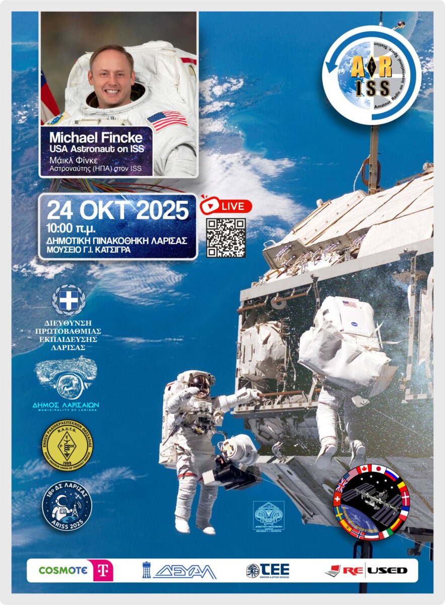H Διεύθυνση Πρωτοβάθμιας Εκπαίδευσης Λάρισας, προσκαλεί τις σχολικές μονάδες και τους πολίτες της Λάρισας και της ευρύτερης περιοχής, στην ιδιαίτερα ξεχωριστή και σημαντική δράση με τίτλο «L-ARISS-A αποκλειστικό: Επικοινωνία του σχολείου μας με αστροναύτη του ISS», η οποία θα πραγματοποιηθεί σήμερα, Παρασκευή 24 Οκτωβρίου, στη Δημοτική Πινακοθήκη Λάρισας – Μουσείο Γ. Ι. Κατσίγρα, στις 10 π.μ..