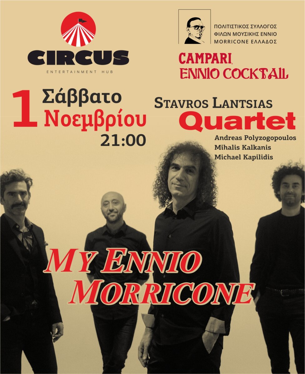Ο πολιτιστικός σύλλογος φίλων μουσικής Ennio Morricone Ελλάδας στη μνήμη του Ennio Morricone διοργανώνει συναυλία με το Μουσικό Κουαρτέτο του Σταύρου Λάντσια με τον τίτλο “my ennio morricone”, στο Circus Entertainment Hub Ερυθρού Σταυρού 4 στην Λαρισα, το Σάββατο 1 Νοεμβρίου 2025 και ώρα 21:00.