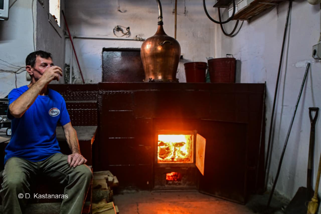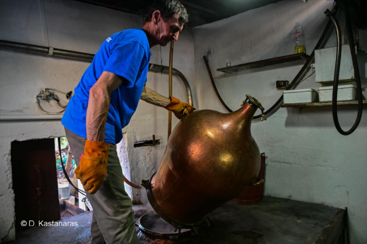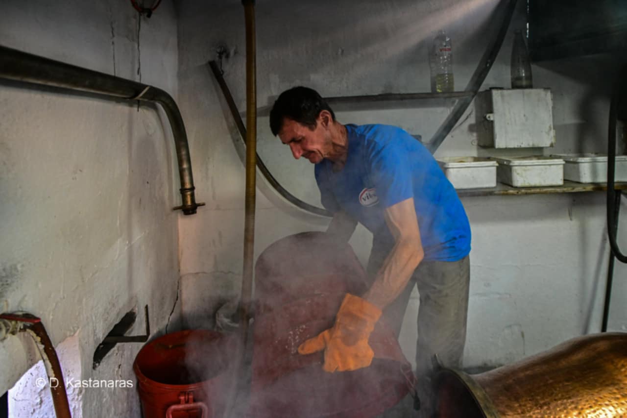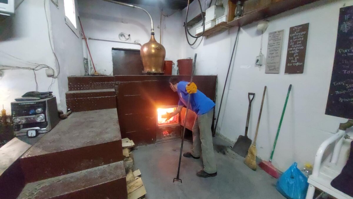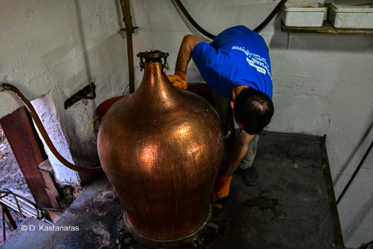 Κατά τη διάρκεια της επίσκεψής μας, παρουσιάστηκε αναλυτικά η διαδικασία της απόσταξης μέσα από εικόνες που αποτύπωναν κάθε στάδιο: από το γέμισμα του καζανιού με τα στέμφυλα, μέχρι τη συλλογή των πρώτων σταγόνων του αποστάγματος. Ένα θέαμα που, κάθε φορά, μοιάζει με ιεροτελεστία.